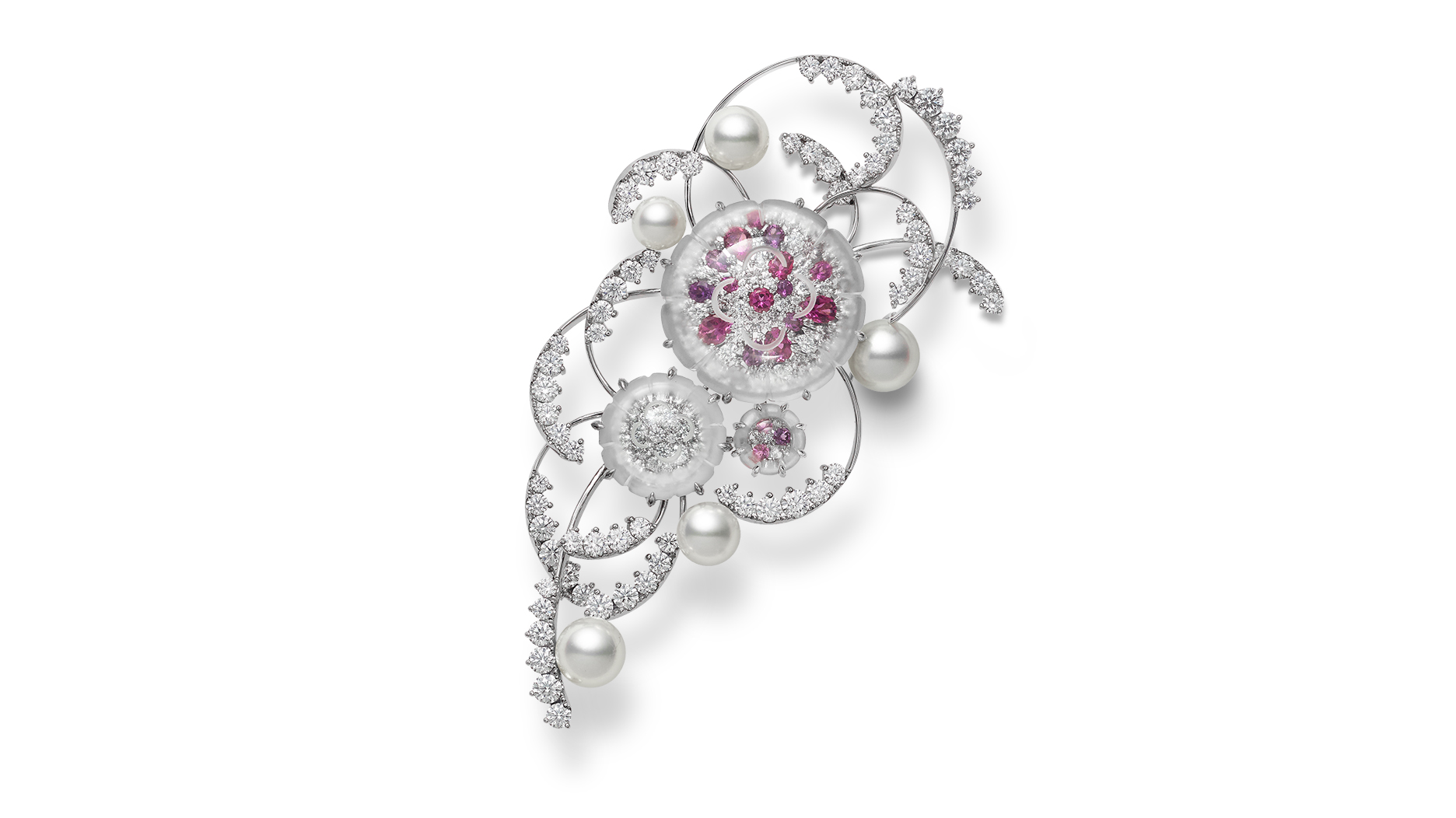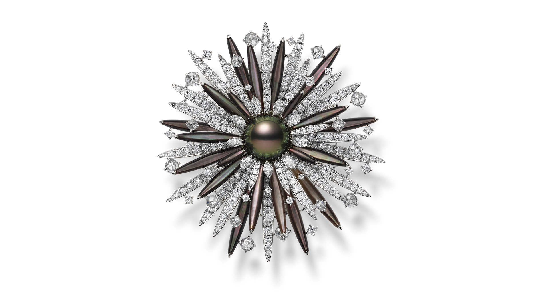 Other pearls also were utilized, such as black South Sea cultured pearl and mother-of-pearl seen in the sea urchin brooch, as well as white South Sea pearl used in the Spotted Eagle Ray brooch, designed to invoke the gentle sunlight reflecting from the animal seen when viewing the animal under the water.