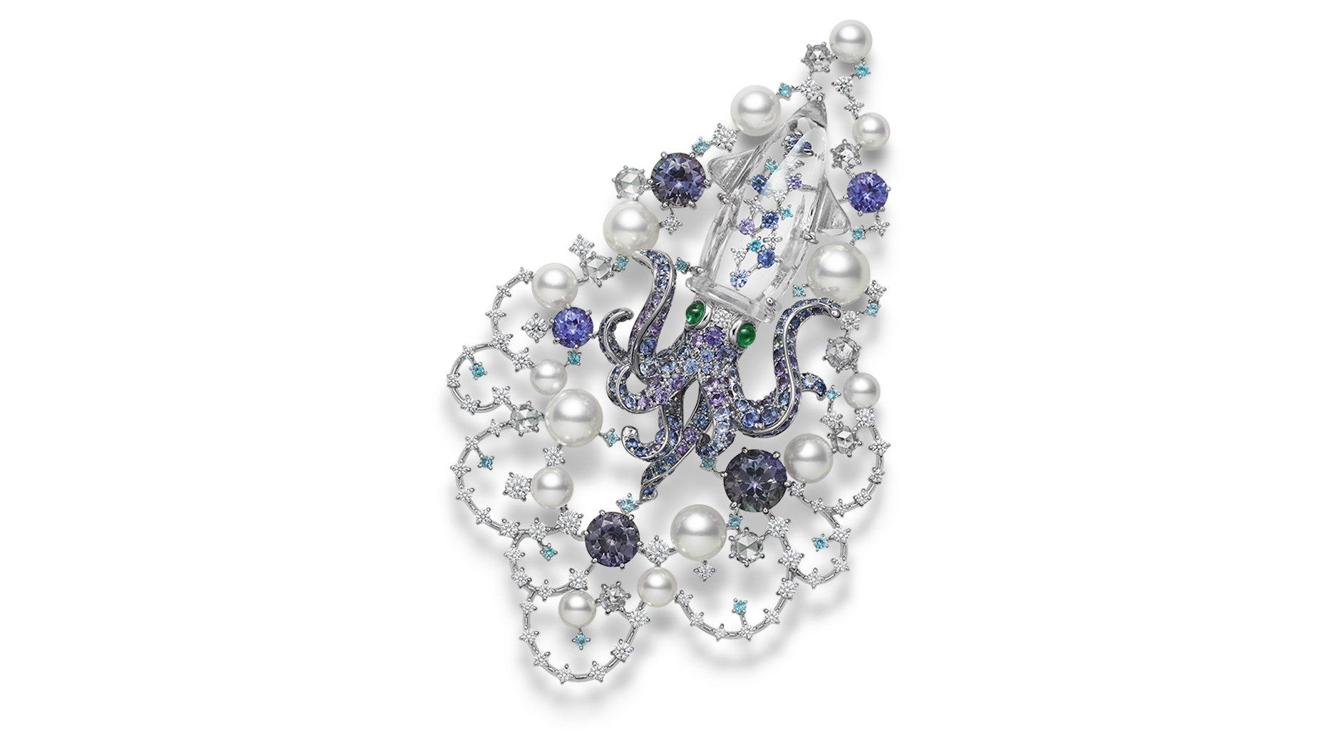 The octopus features a translucent pearl body with diamond-studded tentacles and sapphire eyes, while the squid is made up of ocean-hued gems, a clear quartz mantle and appears to float in a bubbly sea of surrounding pearls and other precious stones.