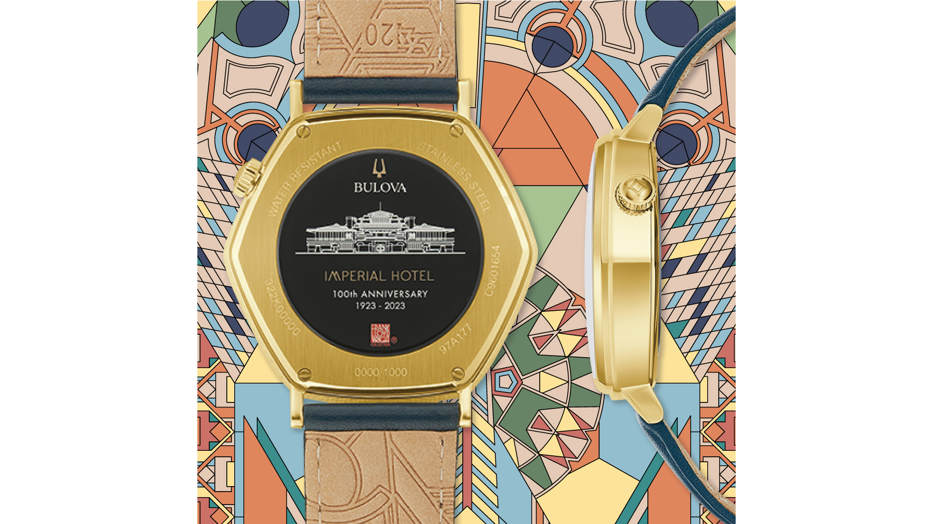 Bulova said its Imperial Hotel watch focuses on a specific geometric peacock detail found in the hotel’s mural and carpeting, which is reflected in the rounded-edge hexagon shape of the dial as well as in the multi-layered printed graphic dial.