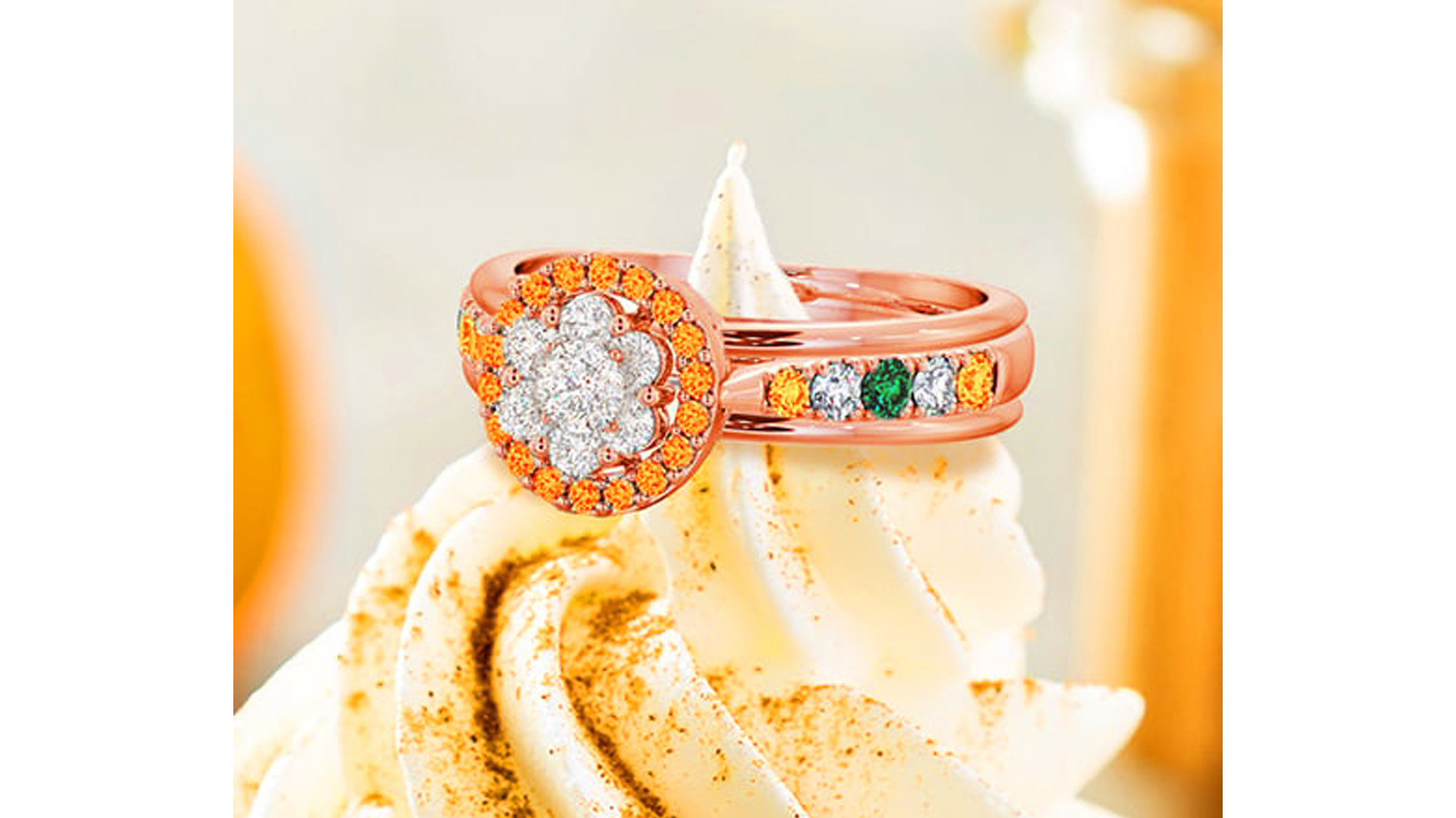 From U.K.-based jeweler Angelic Diamonds, the tribute to the popular drink includes a rose gold band, evocative of a pumpkin’s shape, with a "whipped cream-shaped” center diamond surrounded by a cluster of white diamonds and orange sapphires in a “cup-shaped claw."