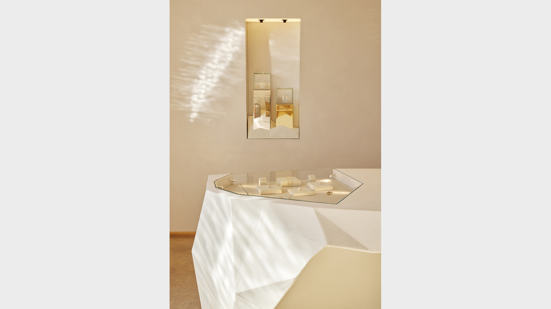 The bold, angular storefront design is echoed in the interior’s mirrors, custom display cases, and furnishings, like a chiseled plaster table.