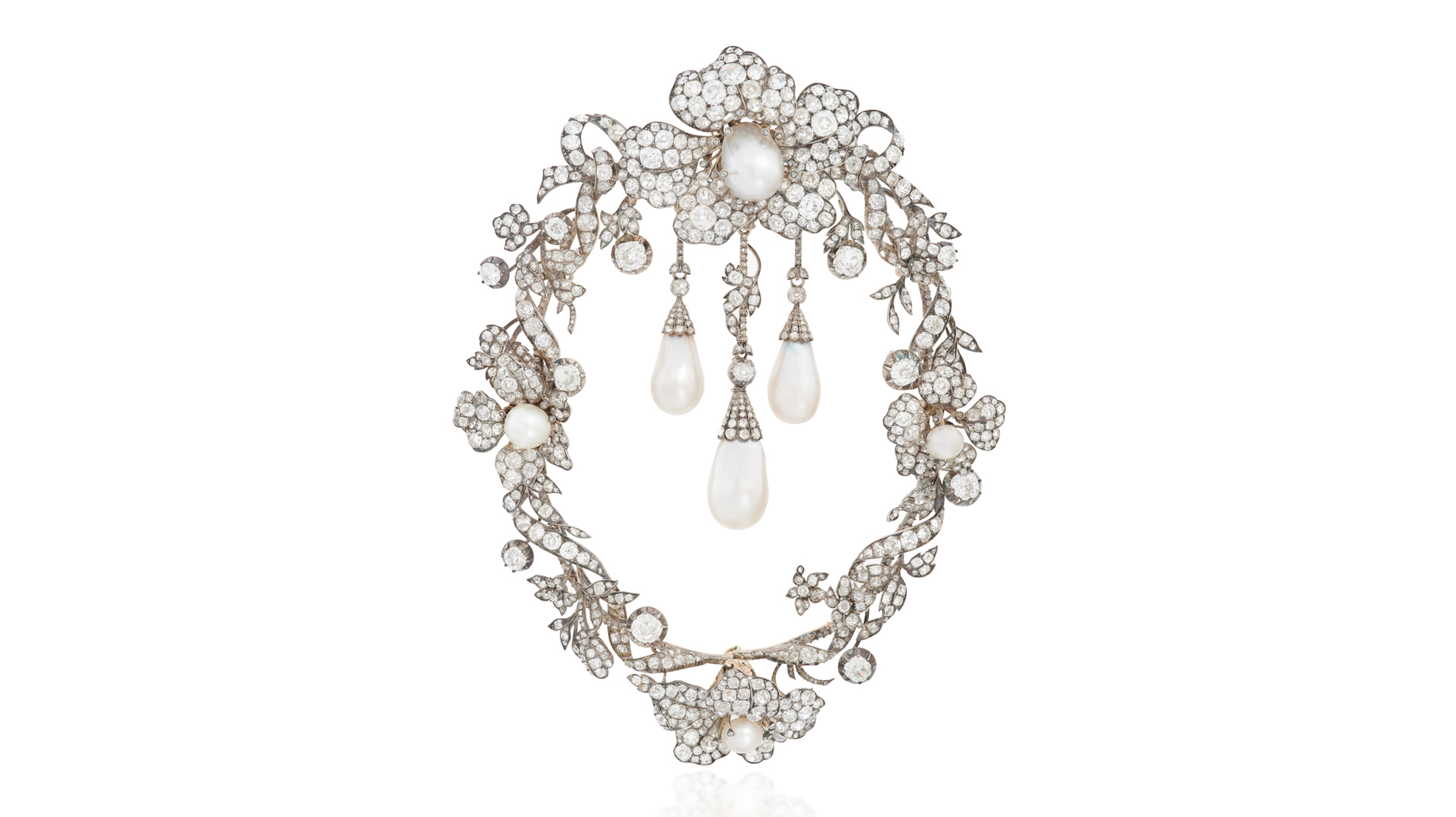 The corsage ornament featuring “exceptional” natural pearls and diamonds (pictured above and at top of article) was presented to Archduchess Marie Therese of Austria-Teschen (1845-1927) as a wedding gift in 1865.