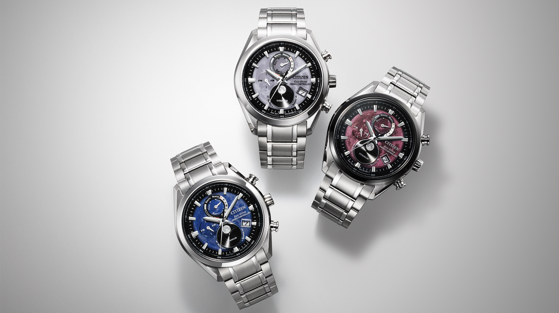 Each model has the Eco-Drive Cal. H874 movement. The watch calculates the phase of the moon each day by receiving signals from multi-band radio transmitters, a process that relies on a mathematical formula Citizen has developed called “Luna Program.”