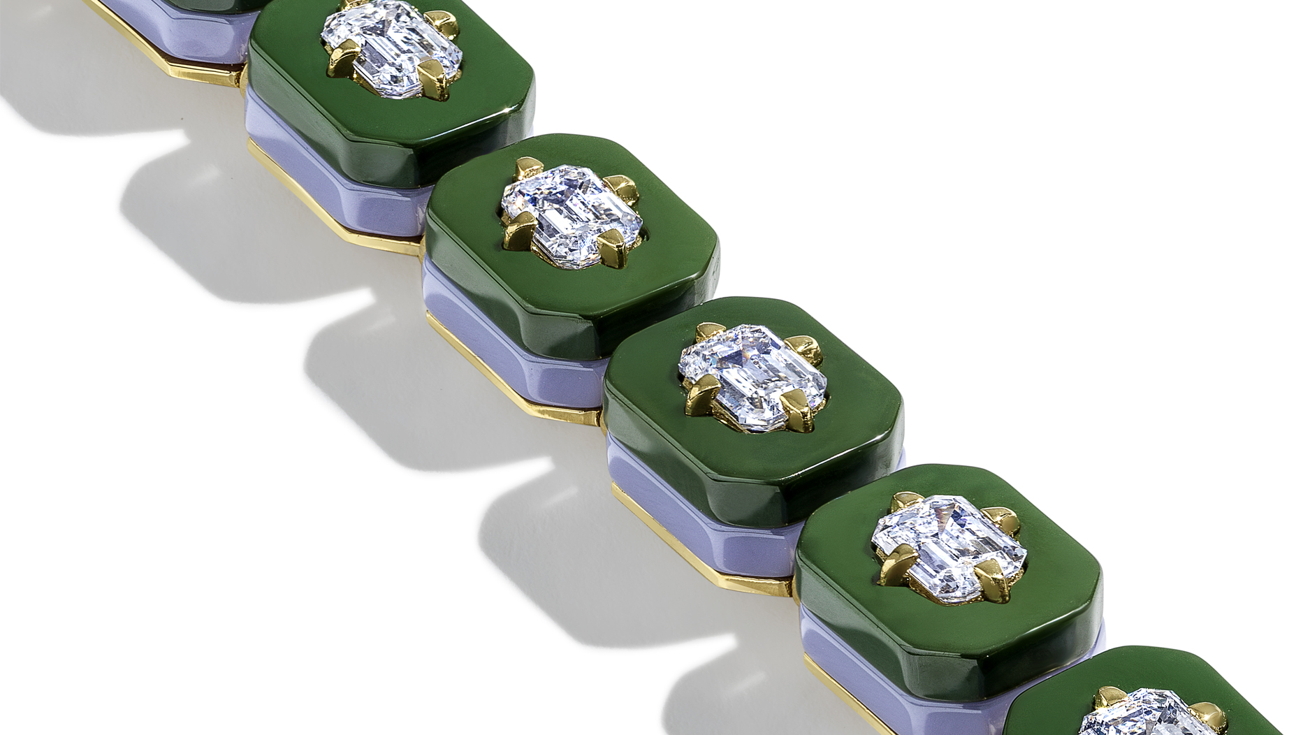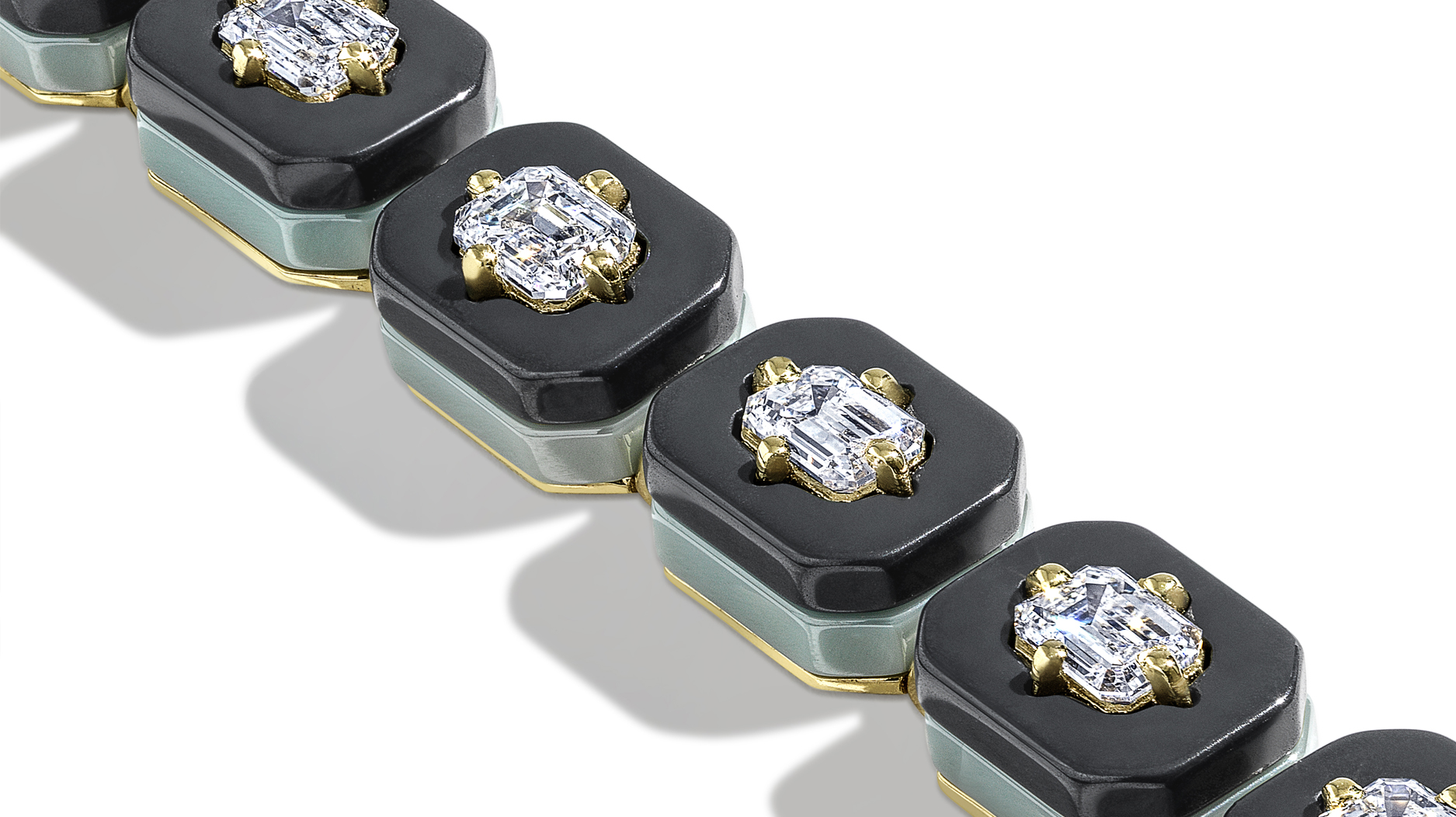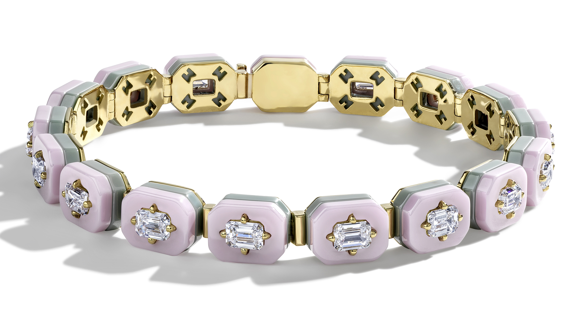 The signature Minty Diamonds piece is a tennis bracelet comprised of lab-grown diamonds, recycled 18-karat gold, and two layers of ceramic.