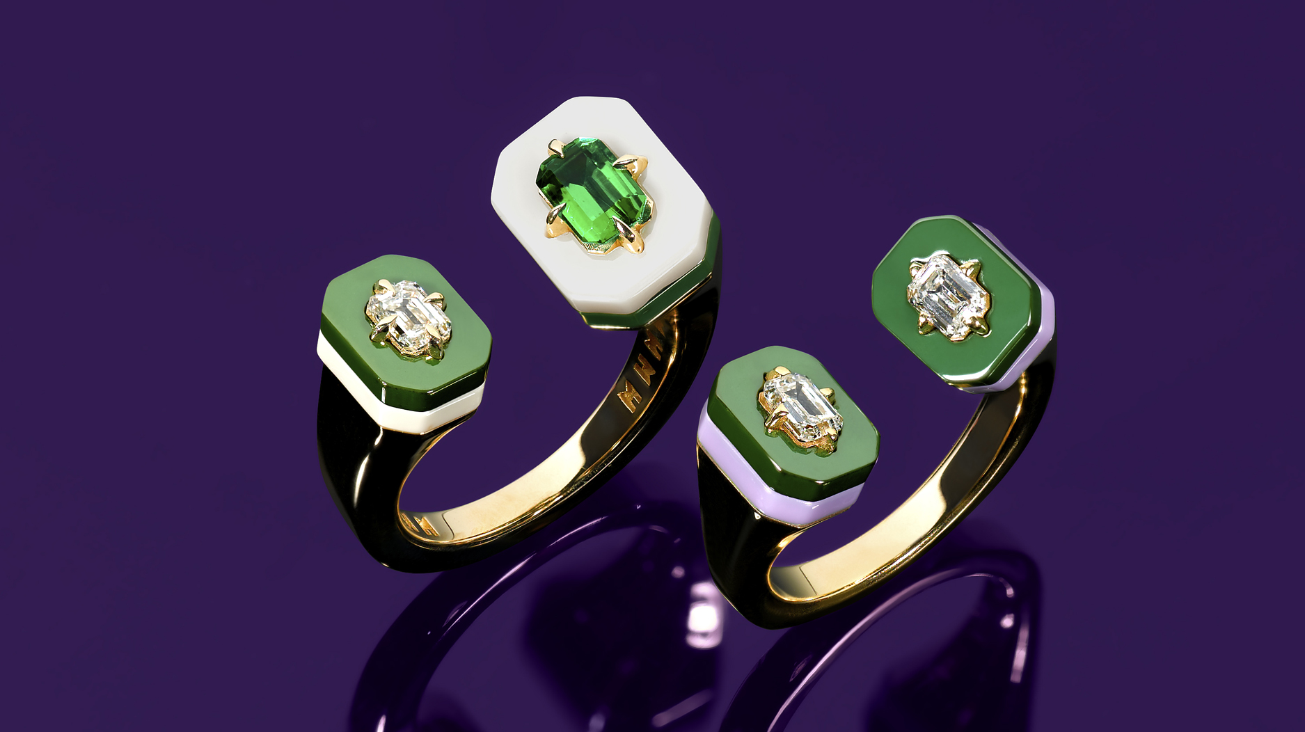 The decision to utilize lab-grown diamonds, emeralds, and sapphires wasn’t a matter of cost for brand Minty Diamonds. Rather, it’s part of a conversation on material innovation. Pictured are lab-grown diamond, 18-karat gold, and layered ceramic eternity bands from the emerging label.