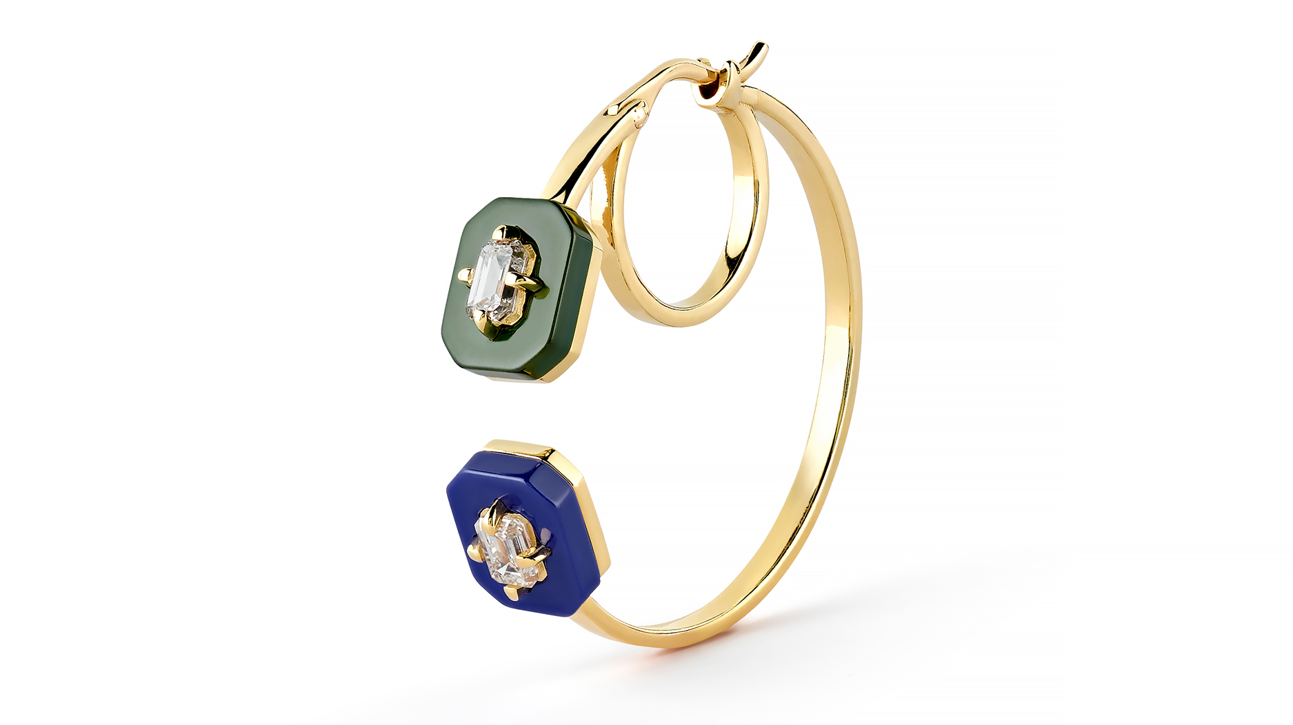 Two views of a Minty Diamonds lab-grown diamond, 18-karat gold, and ceramic huggie hoop earring