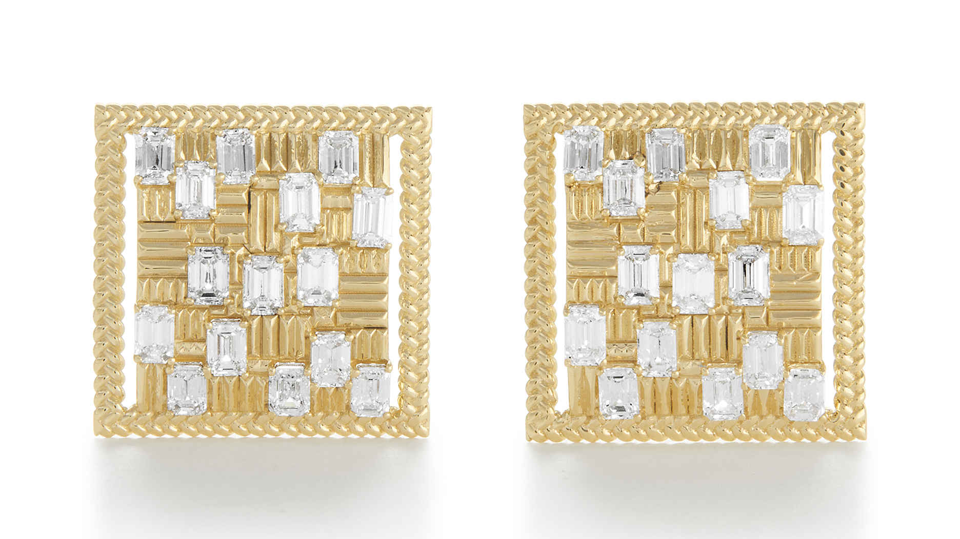 She likes to play with the types of textures and patterns normally reserved for fabric, like my personal favorite from her “Woven Escena” collection, a pair of 14-karat framed drop earrings dotted with VS-clarity emerald-cut diamonds.
