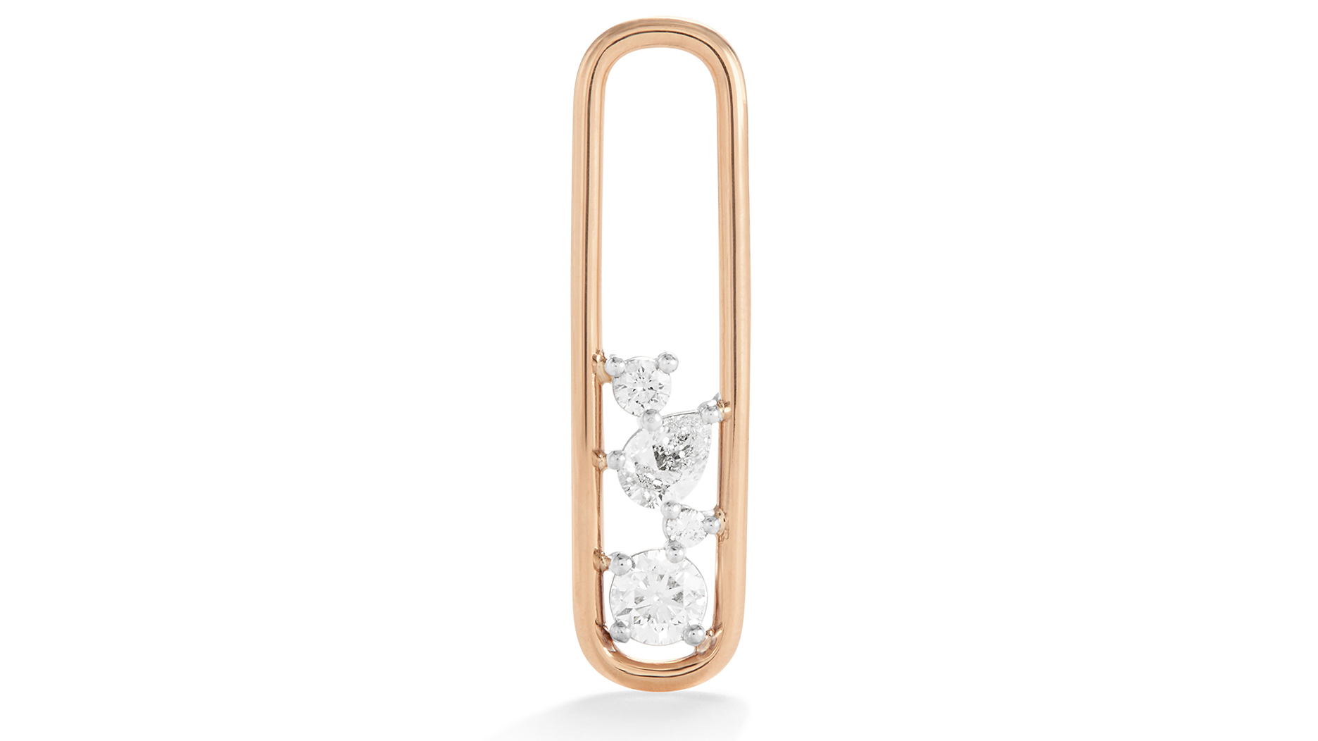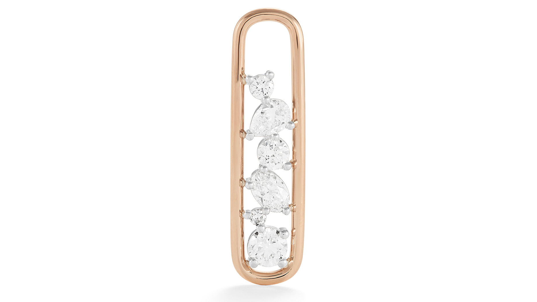I’m a fan of both as well, and I think they work particularly well in Navia’s “Link” ring, which is available in 18-karat yellow, white or rose gold, and in her mismatched drop earrings, also available in all three metals.