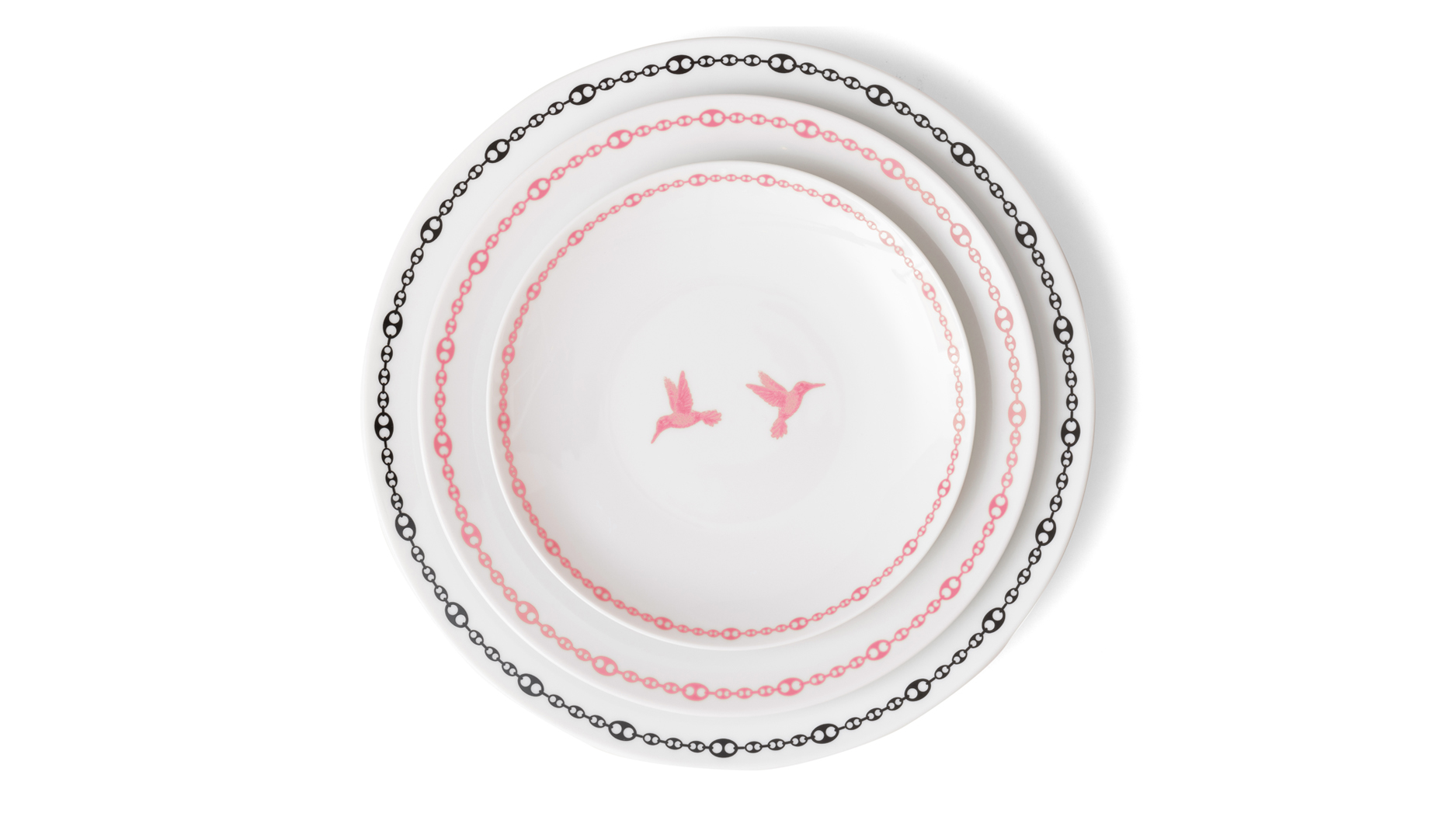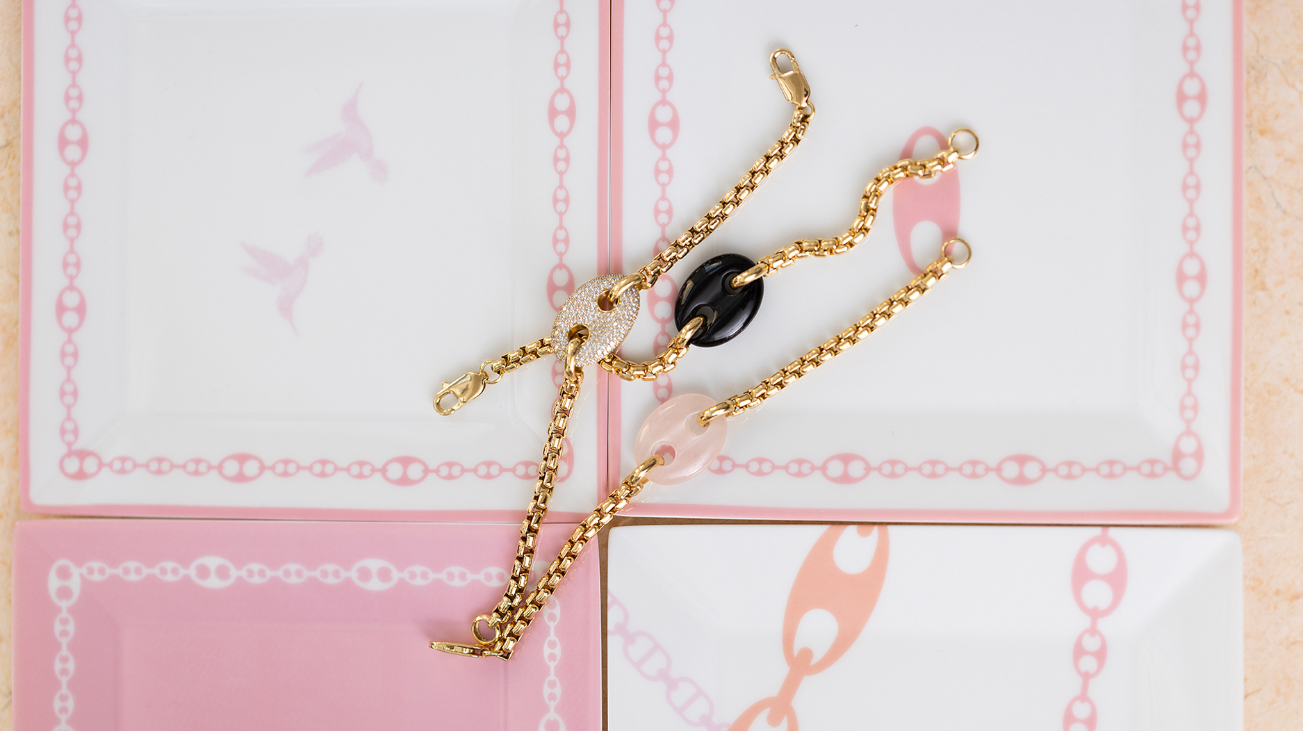 She sees Casa Blake tableware as an extension of the Jenna Blake jewelry world, which favors bold colors and a vintage-feeling aesthetic. The tableware, which Grosfeld calls “jewelry of the table,” complements the jewelry with its warm, playful feel, and even incorporates the signature Jenna Blake mariner link and hummingbird motifs.