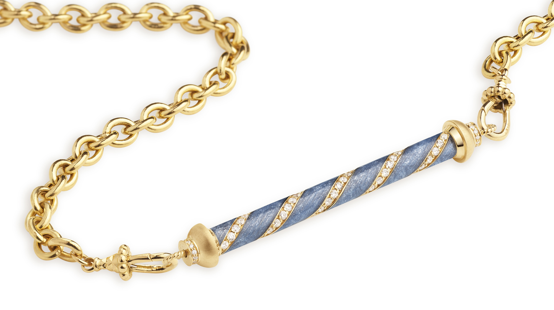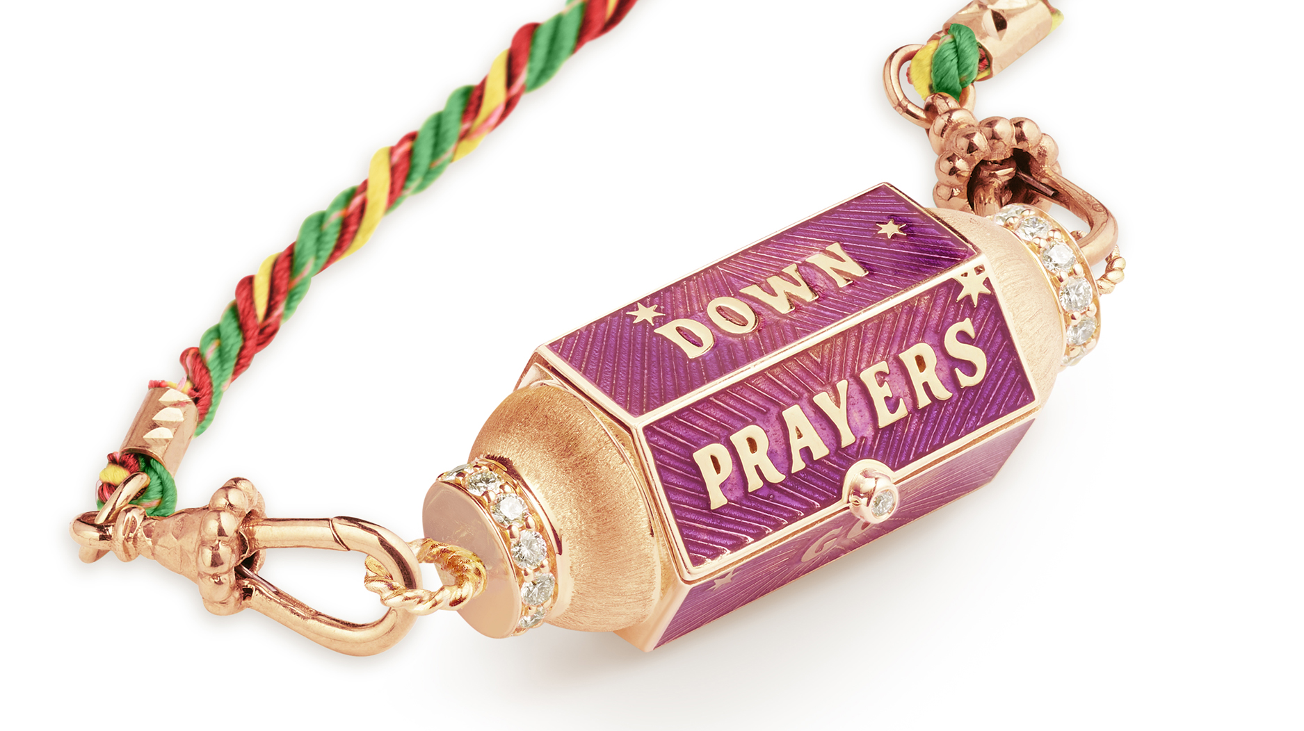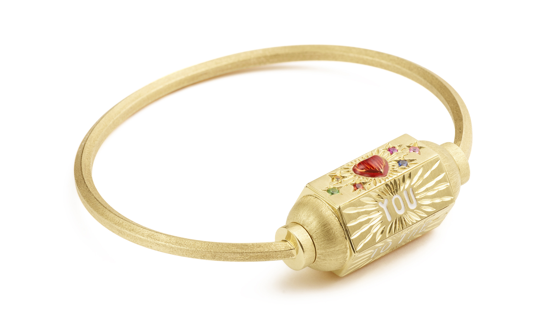 She infused the piece with whimsy and individuality, utilizing engraved patterns, diamonds and colored gemstones, enamels, and text for a contemporary twist.