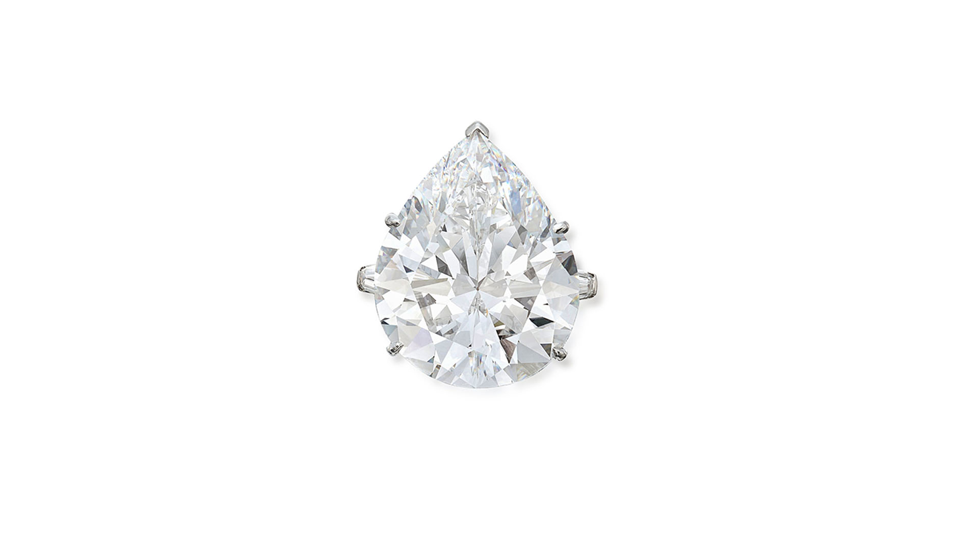 Weighing more than 28 carats each, two pear-shaped diamonds on the ends of the necklace hang suspended from two rows of similarly cut diamonds totaling 120.20 carats.