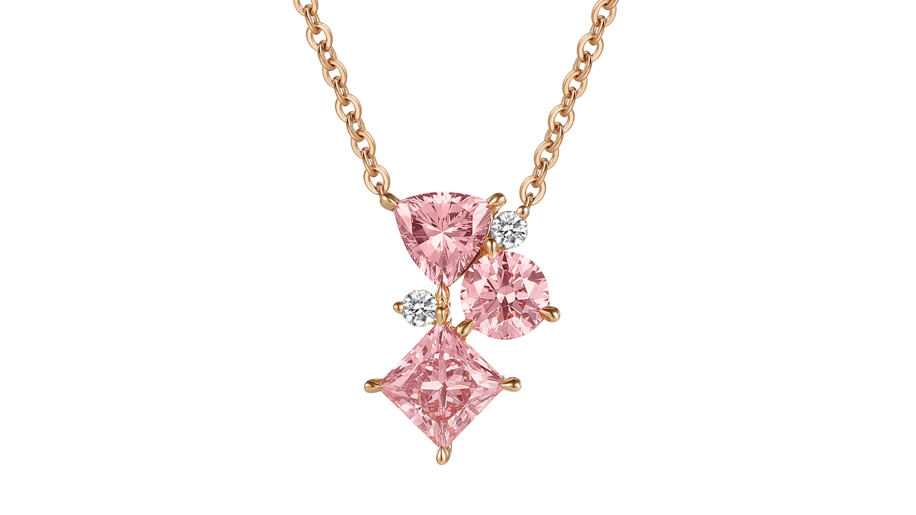 Round brilliant-, trillion-, and princess-cut white, blue and pink lab-grown diamonds are clustered on petite rings, earrings, and necklaces that are meant to be mixed, matched, and stacked.