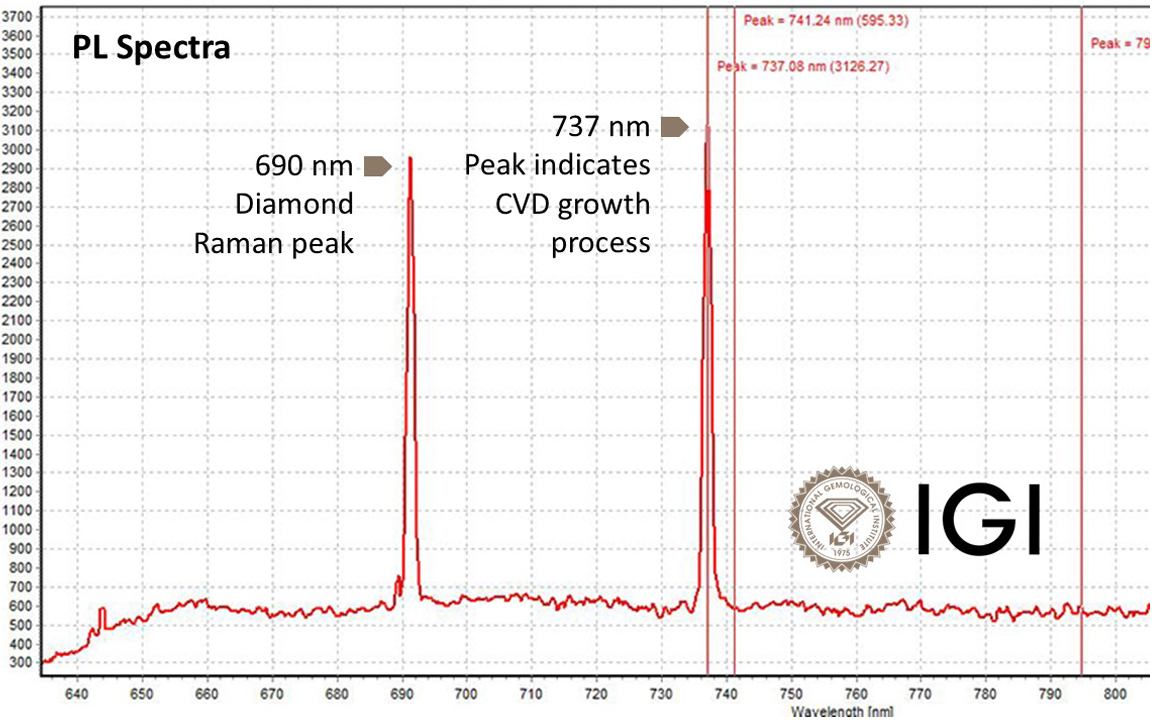 First, the lab said, photoluminescence (PL) spectroscopy, which is now widely used by grading labs to separate natural diamonds from lab-grown stones and to identify diamond treatments, shows a wavelength peak of 737 nanometers in the diamond (see chart below).