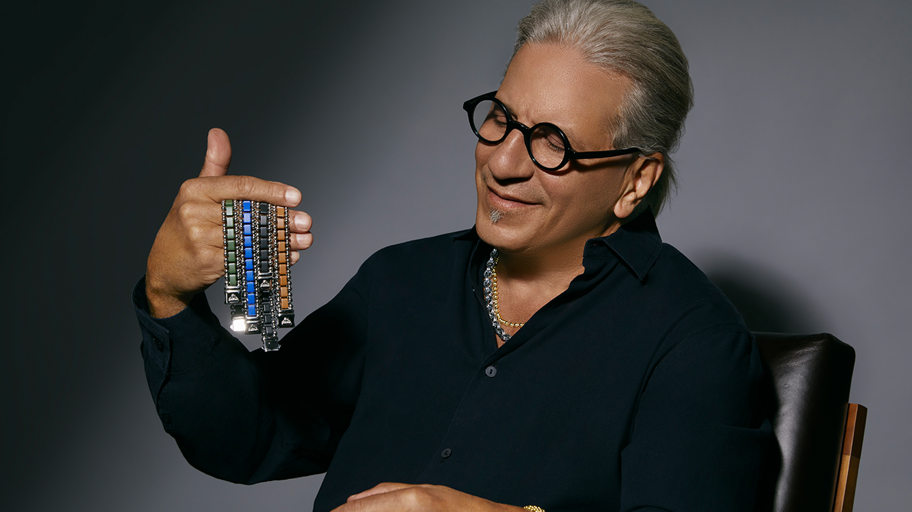 He was styled in the Anthem curb chain necklace, the black agate ring, and the Black Caviar ceramic diamond bracelet.