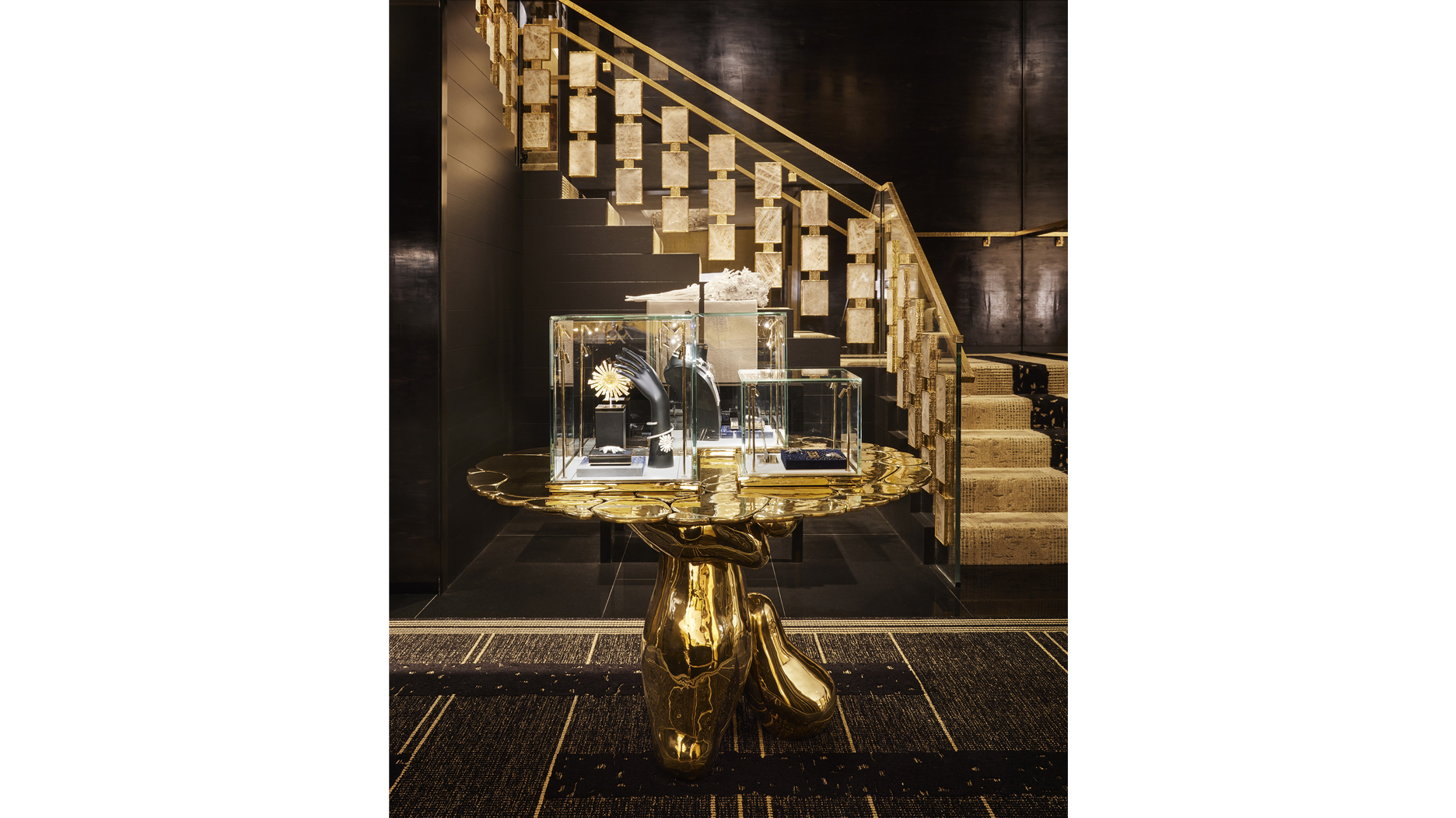 The second floor houses two more fine jewelry salons, one of which is reserved for private clients, as well as a black painted wood wall piece by American sculptor Louise Nevelson, and a tempera, metal, and wood panel by Norwegian abstract expressionist painter Anna-Eva Bergman.