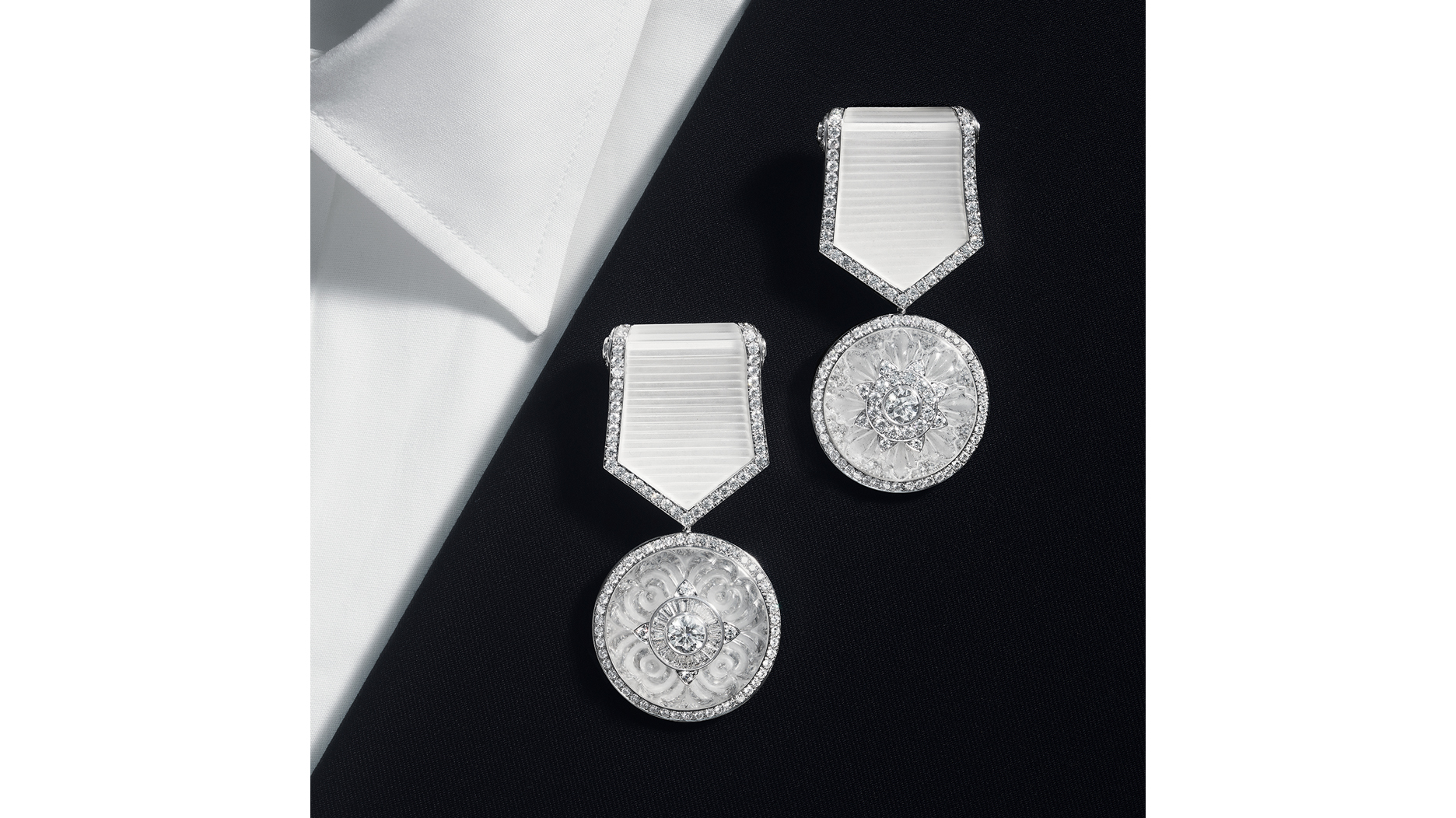 Medals traditionally are worn on the left side of a lapel, close to the heart, the brand said, but in the new interpretation, 15 pendants circle to form a necklace in white gold, rock crystal and diamonds.