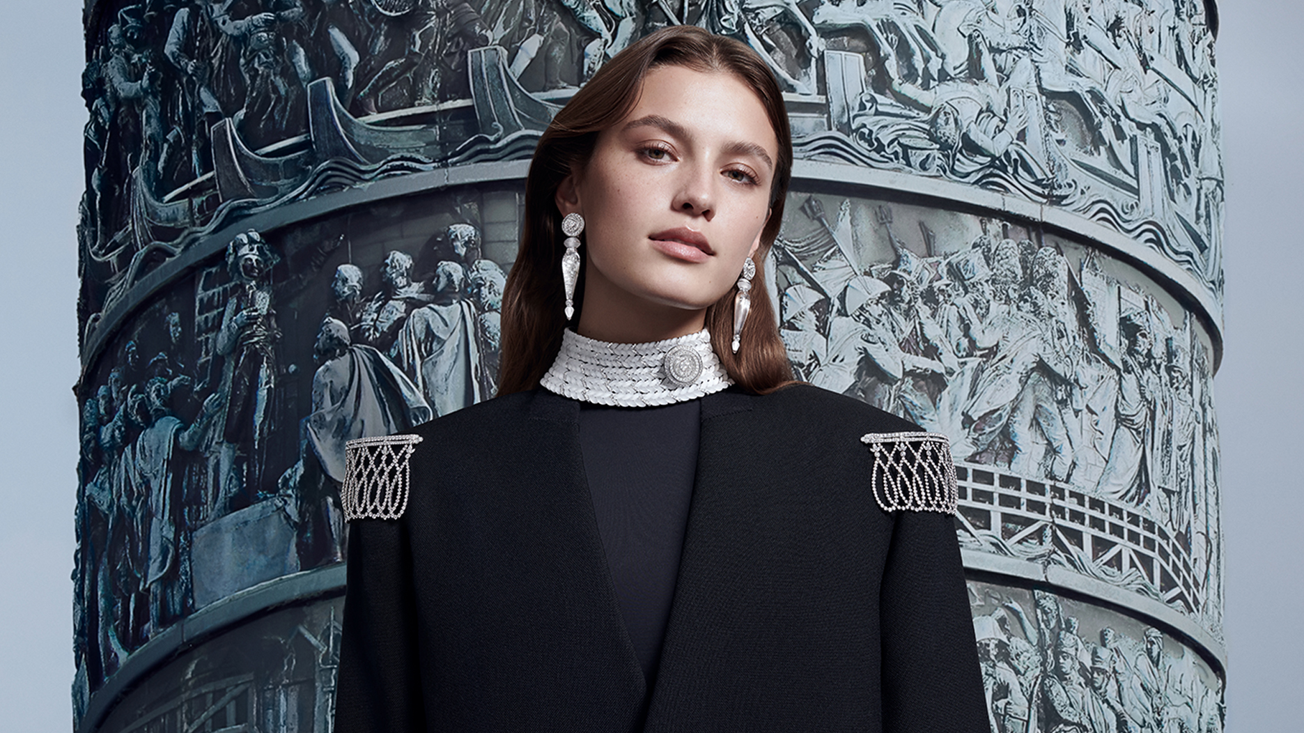 Though Power of Couture shares the same refined lightness as the brand’s earliest fabric-inspired concepts, Choisne opted for a brighter medium for the latest collection—a monochrome palette of rock crystal and diamonds to both temper the baroque character of traditionally gold-tone decorations and bring a visual lightness to the pieces.