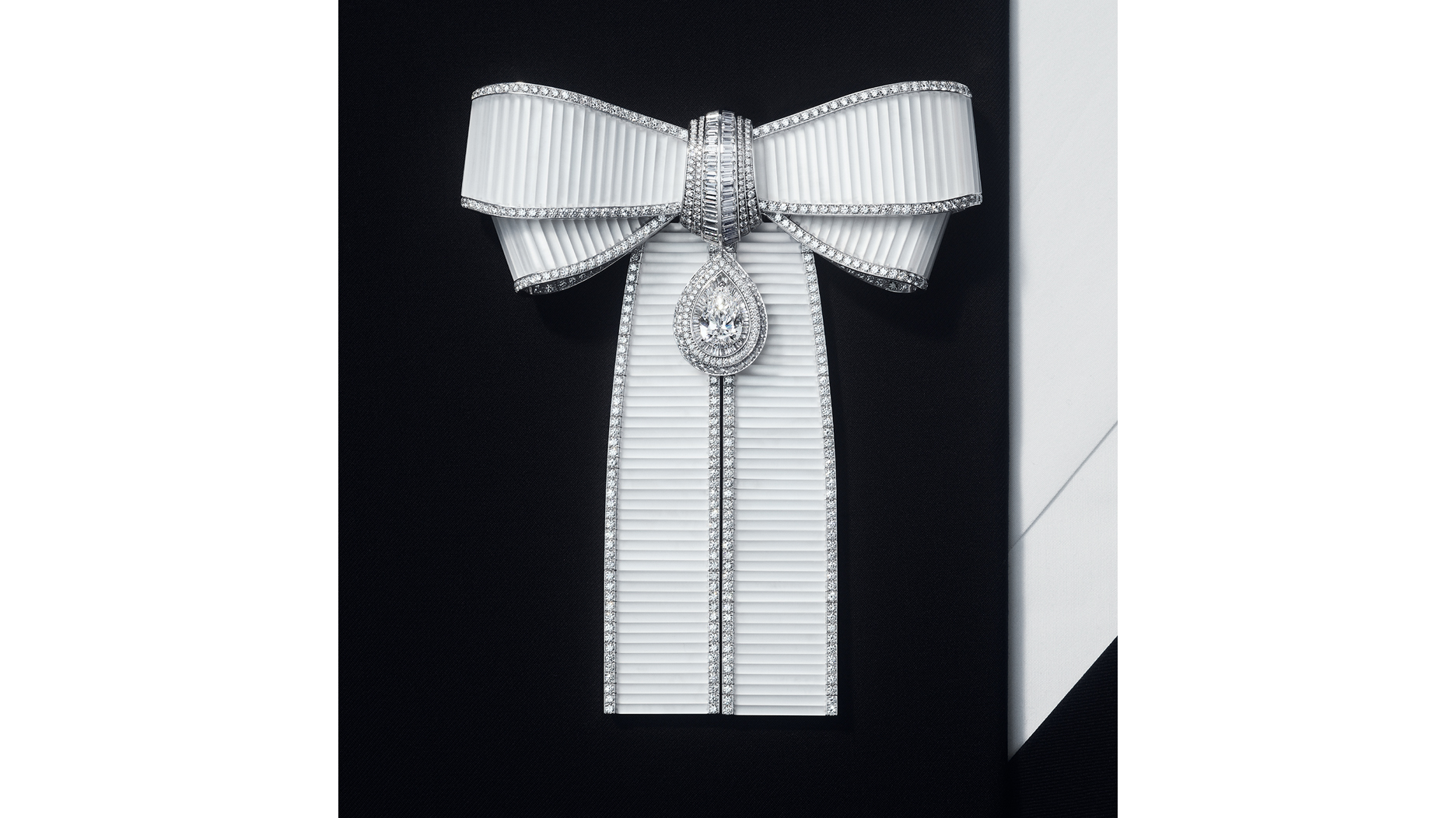 The piece includes 435 frosted baguette-cut rock crystals, each individually hand-cut and set into the white gold framework. The edges and interior of the bow are set with diamonds, and the centerpiece is a 4.05-carat pear-shaped diamond of F color and VVS2 clarity.
