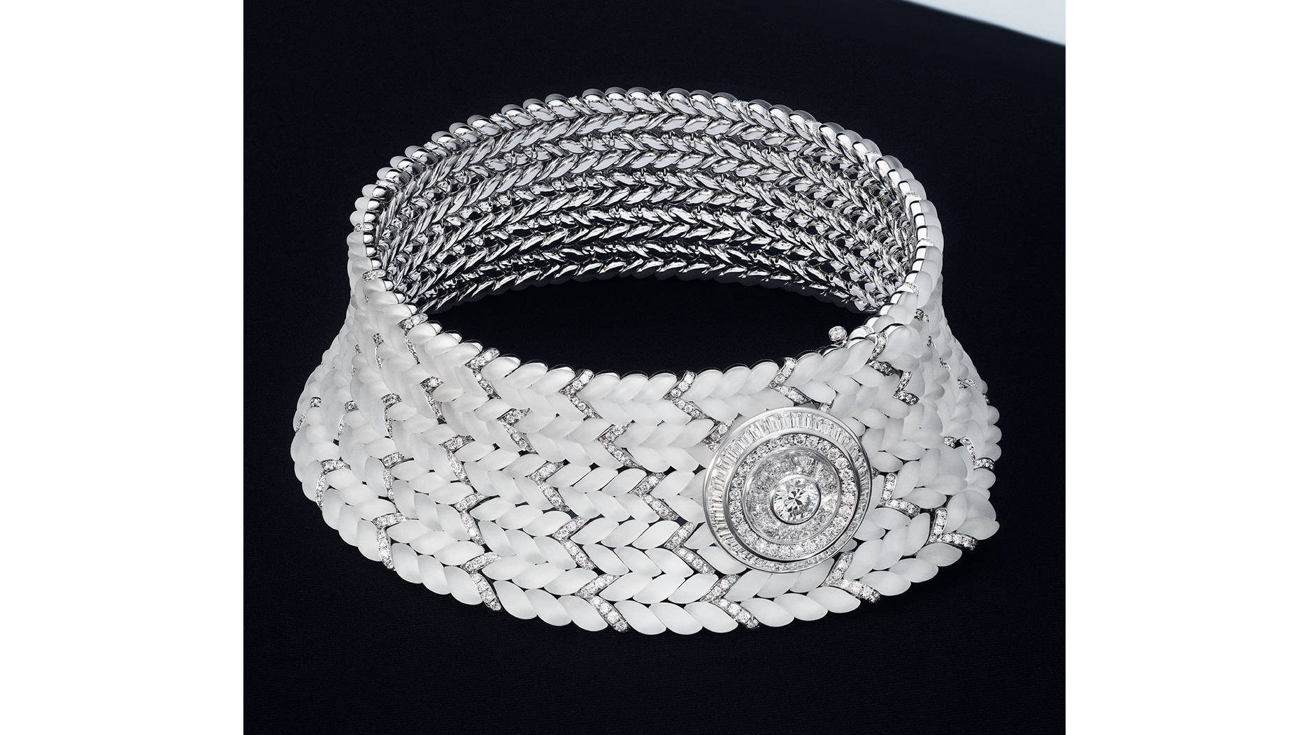 For “Le Tricot,” or “The Knit” choker, rock crystal is shaped into a knit design that imitates a fourragère braid.