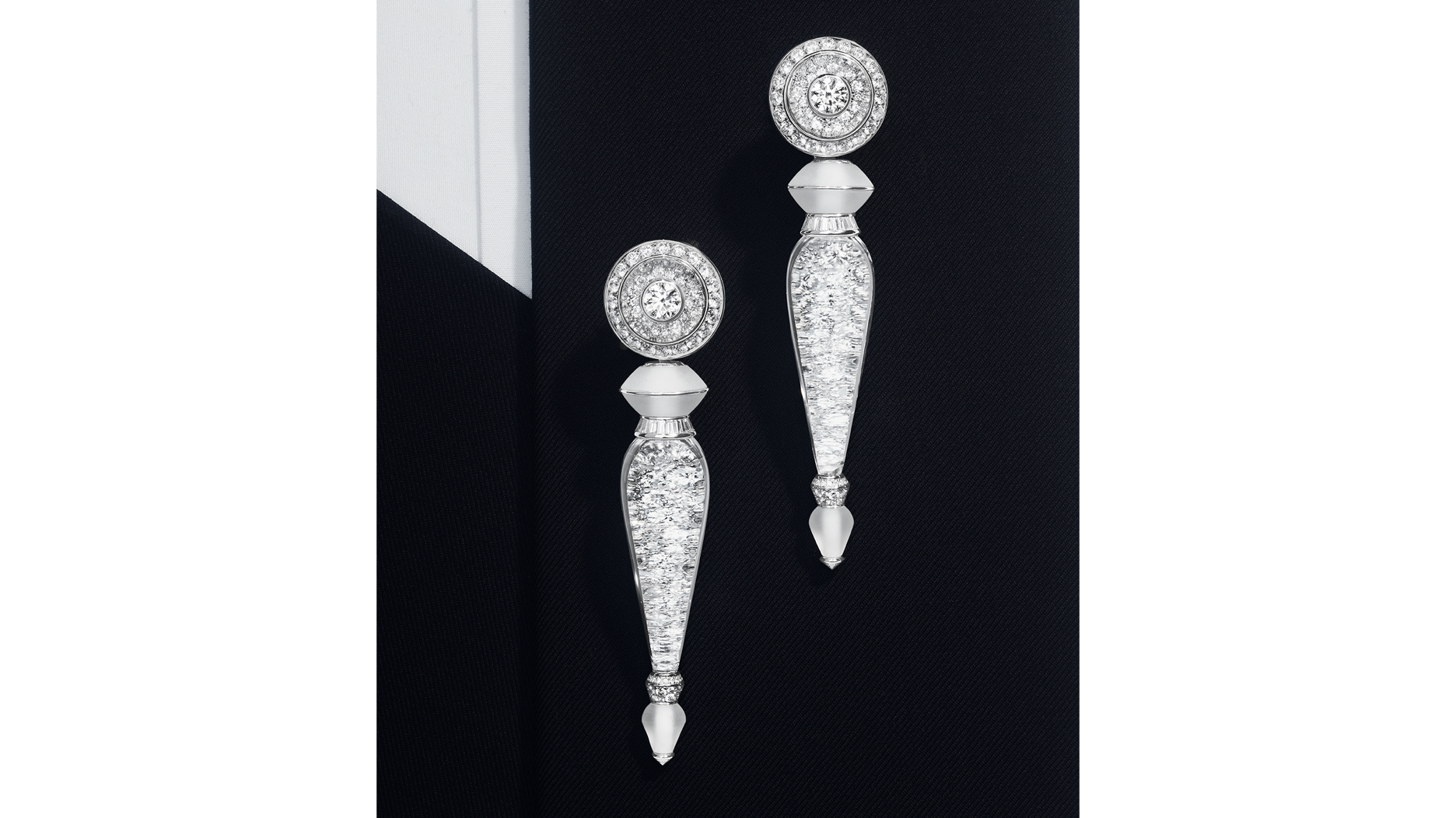 A coordinating pair of pendant earrings in diamond-paved rock crystal may be worn long or short and can be seen paired with Le Tricot on a model above.