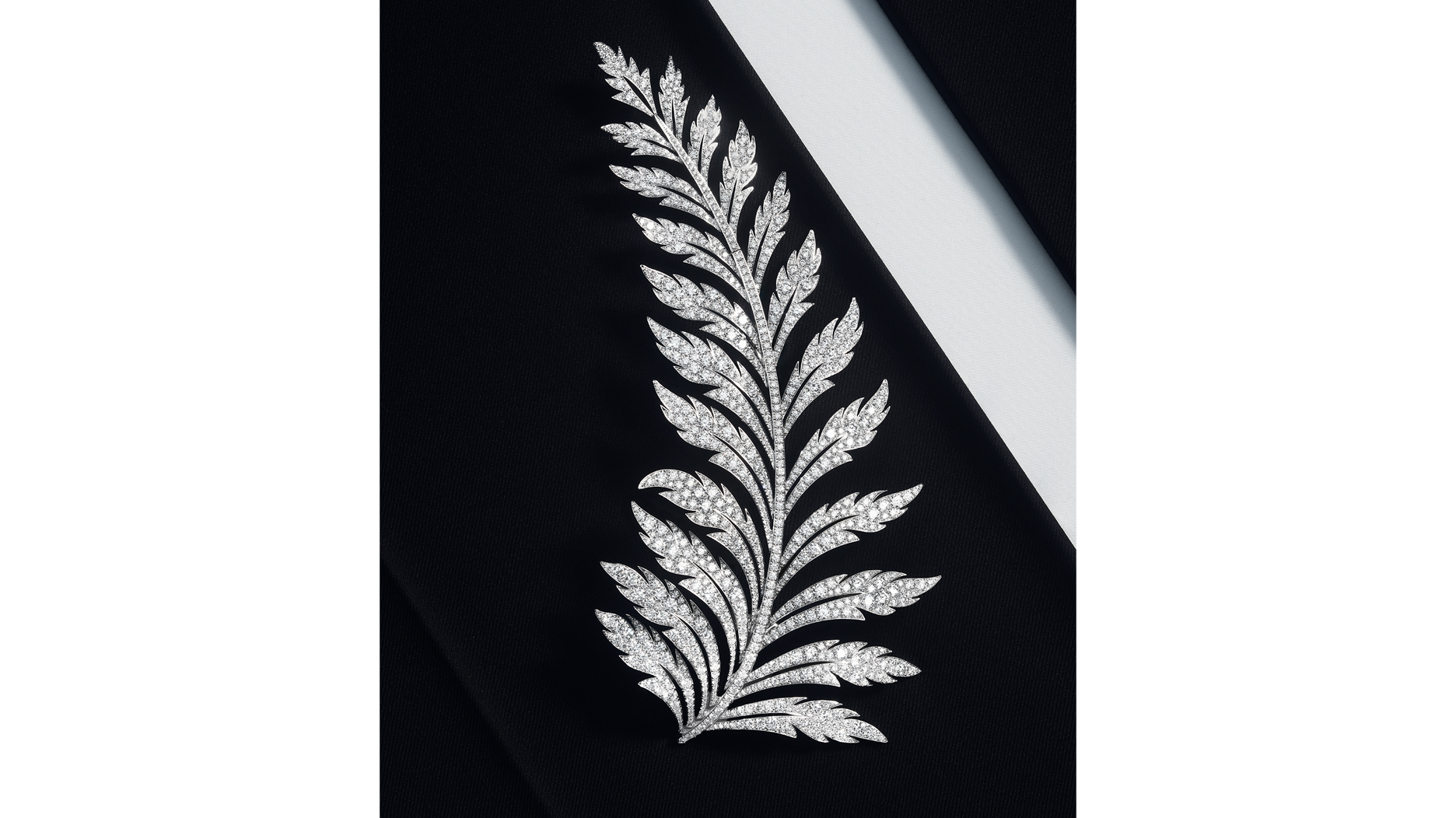 The leaves are paved with diamonds and set in a white gold frame, appearing to have been shaped by the wind.