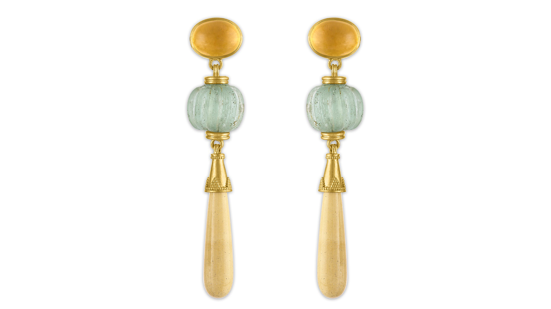 Named after an elongated jar used in Ancient Greece, the “Amphora” earrings feature golden citrine, nasturtium seed-shaped Roman glass beads, and fawn-colored jasper.