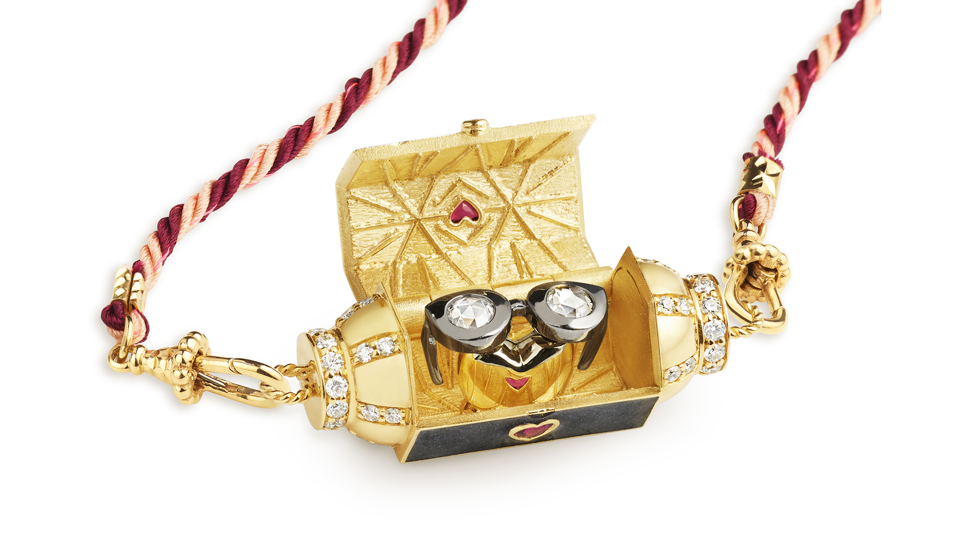 The locket is 18-karat yellow gold with 0.89 carats of diamonds, 0.39 carats of rubies, and enamel on a silk cord.