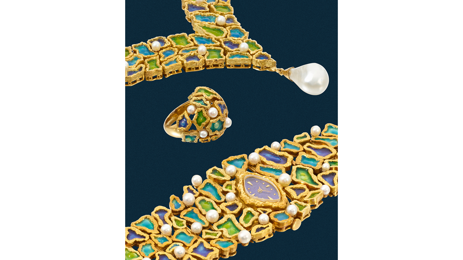 There’s a Corum watch that looks like the grill of a Rolls-Royce from 1980, the circa 1975 Chopard exploding with color (and with a hydrogrossular garnet dial), and the pinky-ring watch from Jaeger-LeCoultre from 1953 that screams mob-wife aesthetic, seen at top of article.