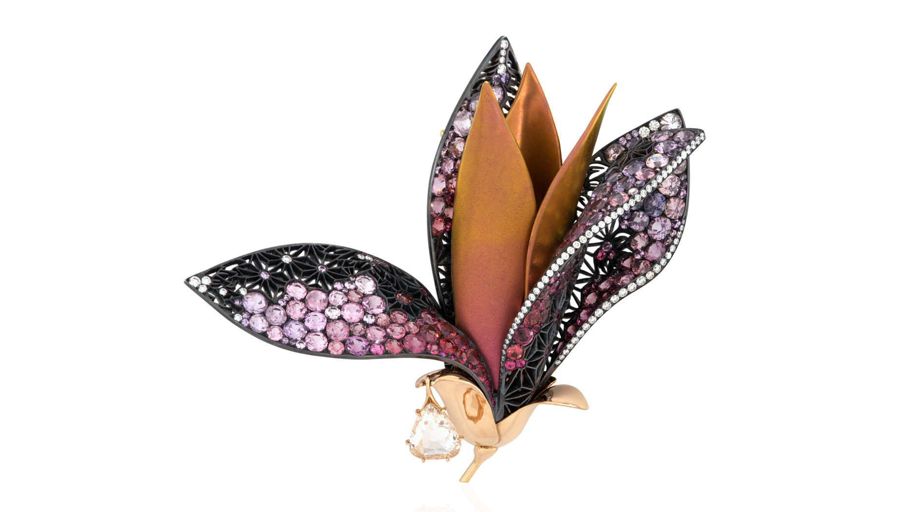 Included in the selling exhibition is Dumas’ “Fleur de Magnolia” diamond, spinel, and sapphire brooch, a piece that led to a win for its designer in the Couture Design Awards’ “Best in Haute Couture” category in 2023.