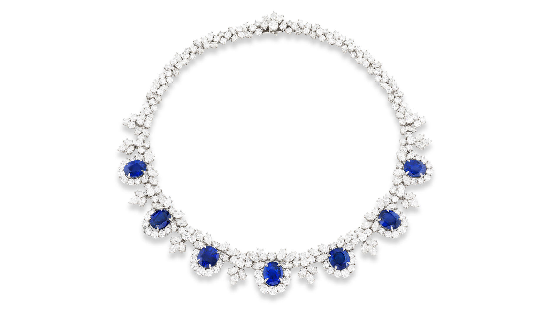 A Harry Winston sapphire and diamond necklace featuring the brand’s iconic cluster design is also a highlight, estimated to sell for up to 240,000 CHF ($260,000).