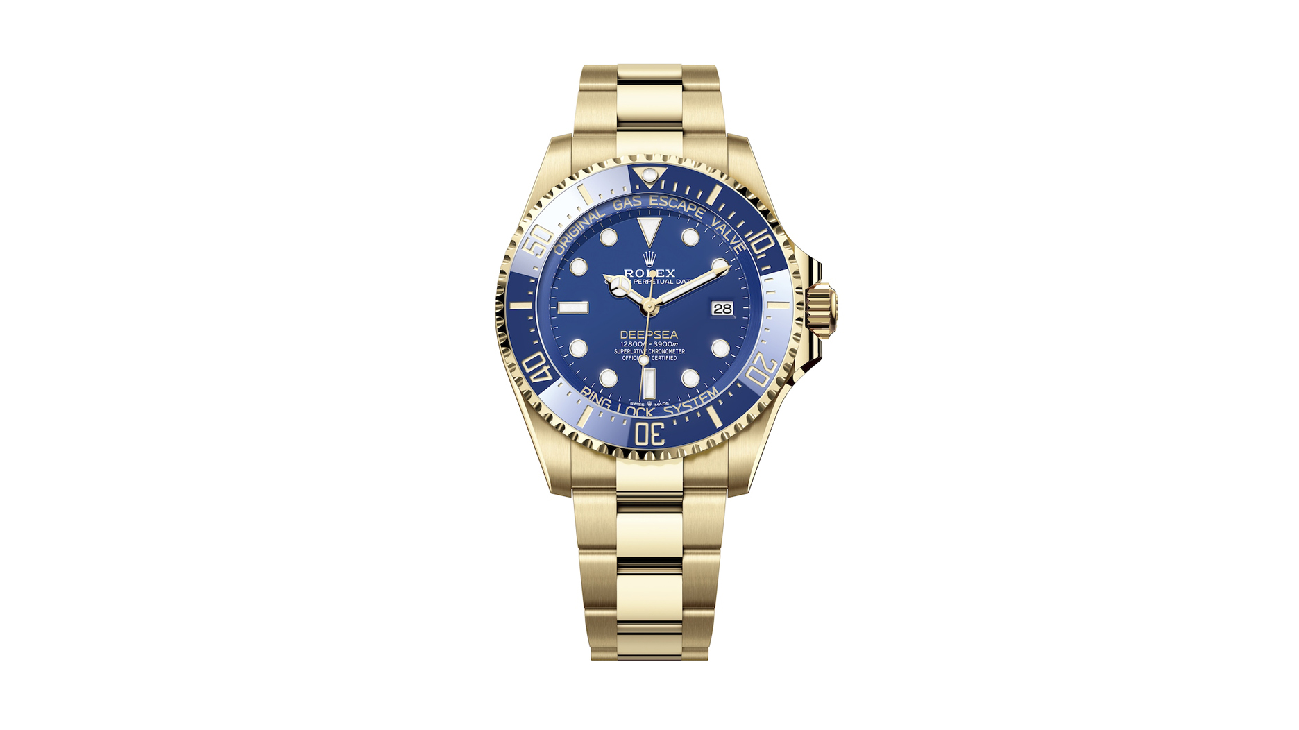 The 44 mm deep-sea divers’ watch is water-resistant to 3,900 meters (12,800 feet) and, as noted on the dial, features the pressure-relieving Ringlock system and helium escape value, which Rolex patented in 1967.