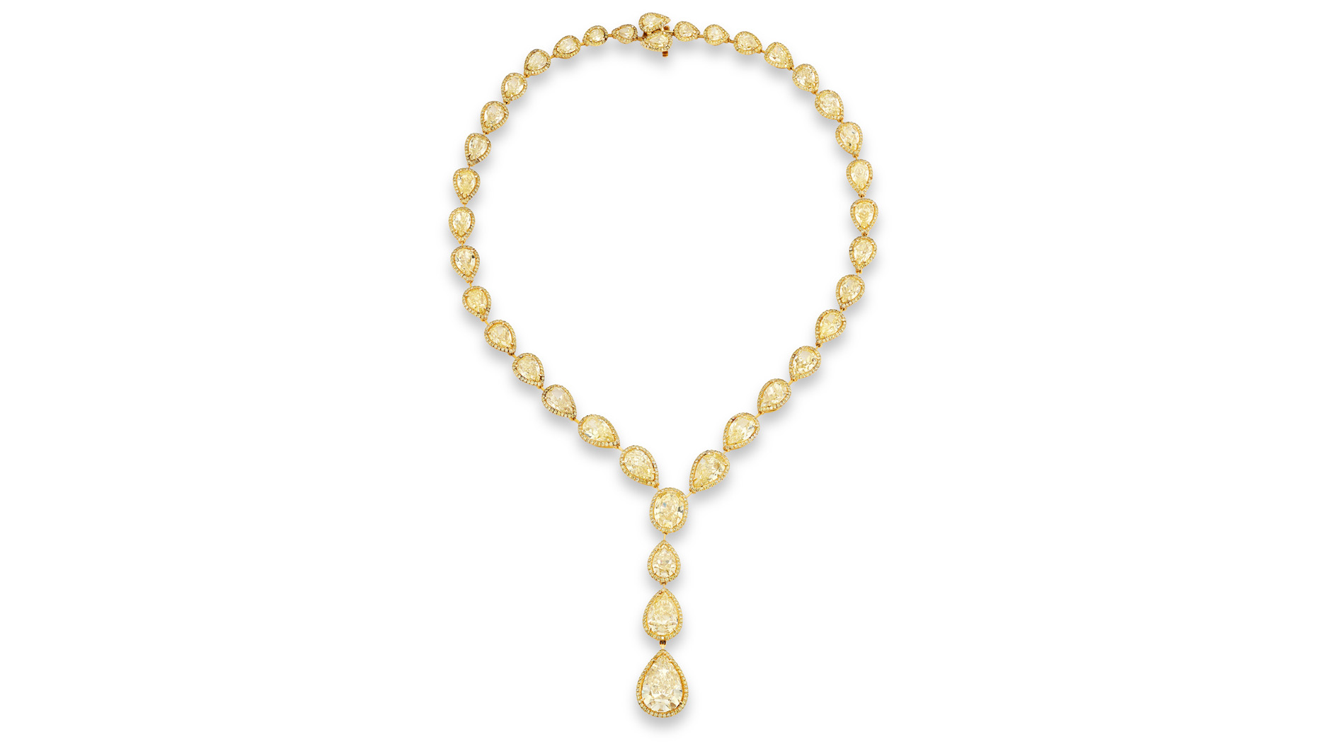 A fancy intense yellow and fancy yellow diamond necklace from Harry Winston estimated to go for up to CHF 460,000 ($508,527), sold for CHF 762,000 ($840,410).