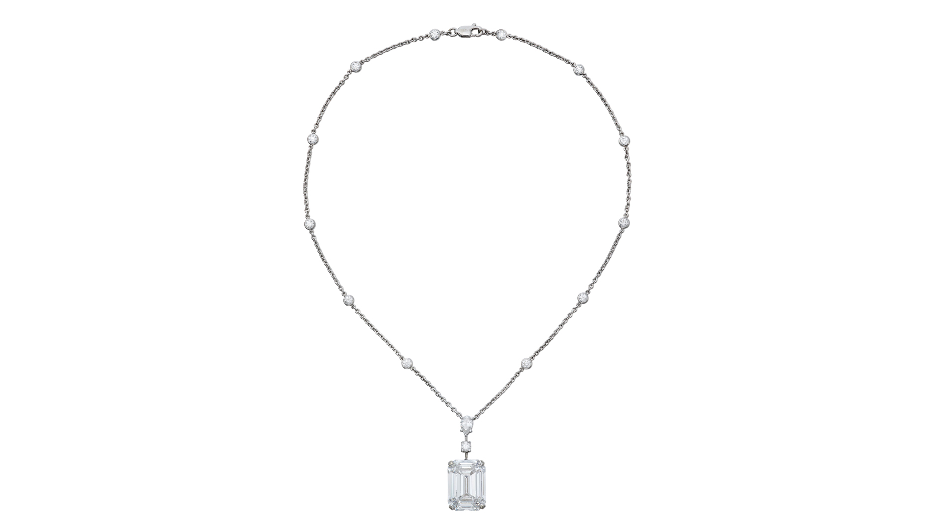 A pendant necklace by Graff featuring a 16.06-carat emerald-cut diamond sold for slightly above its $1 million high-end estimate, going for $1.02 million or $63,512 per carat.