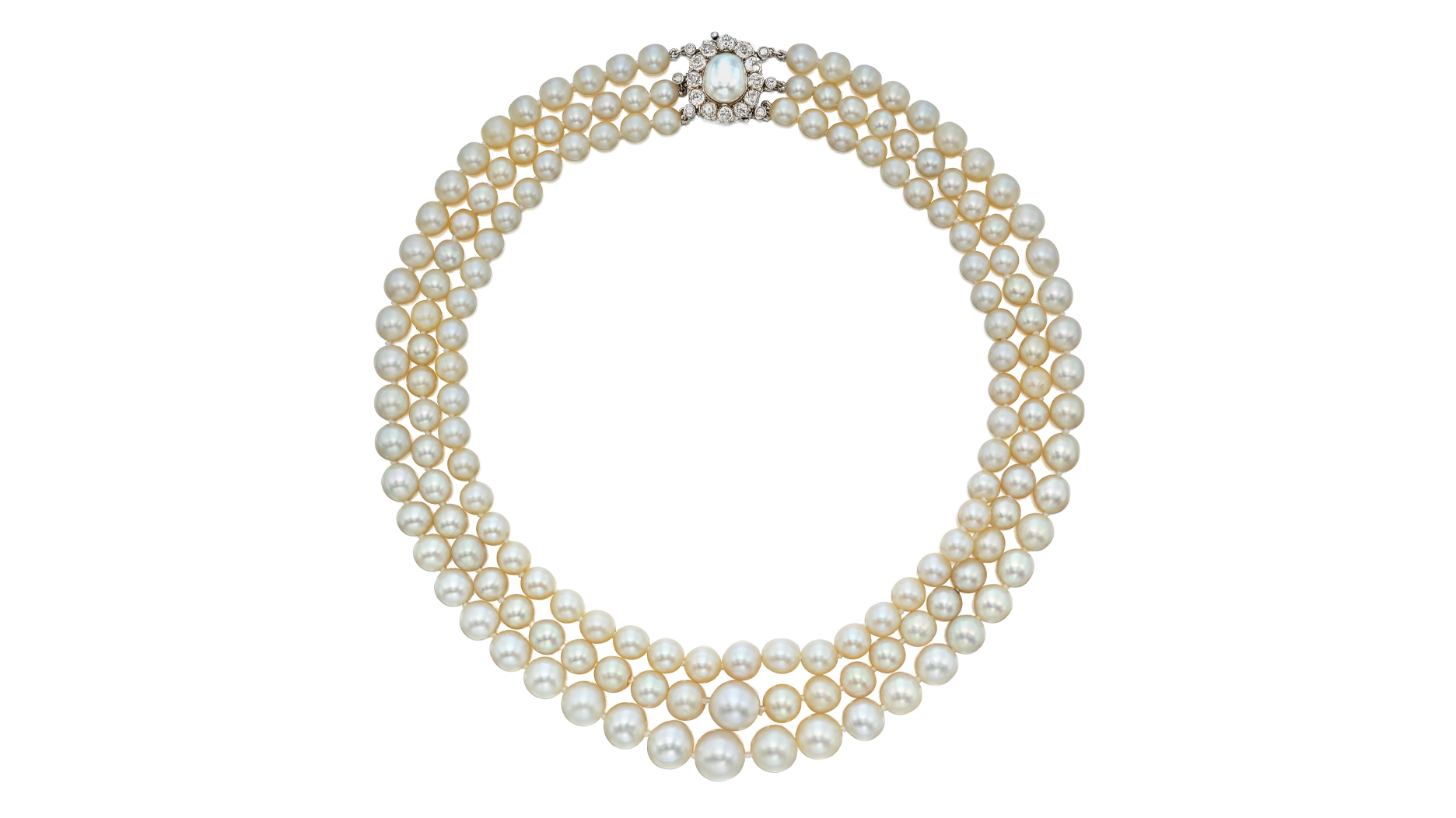 A three-strand necklace featuring natural pearls, cultured pearls, and diamonds achieved $552,000.