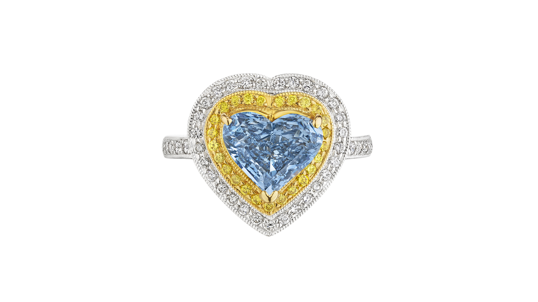 A platinum ring set with a 2-carat fancy vivid blue heart-shaped diamond surrounded by halos of yellow and white diamonds sold for $2.1 million, within its estimated range of $1.6 million to $2.6 million.