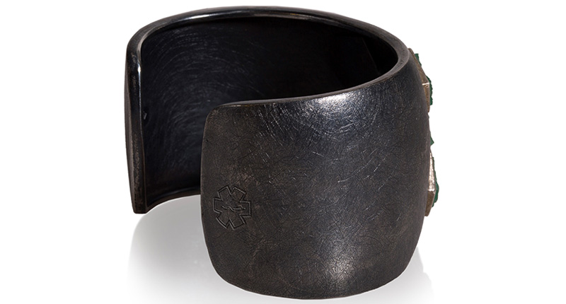 The result was signature Reed--a sterling silver with patina cuff with five pentagon-shaped raw emeralds (Lacroix is a May baby) in