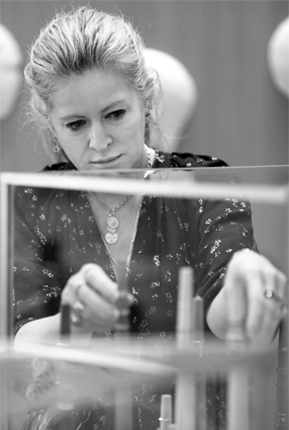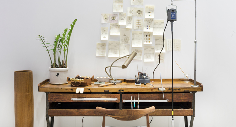 An on-site jeweler will customize Foundrae jewelry for customers at this antique jeweler’s bench.