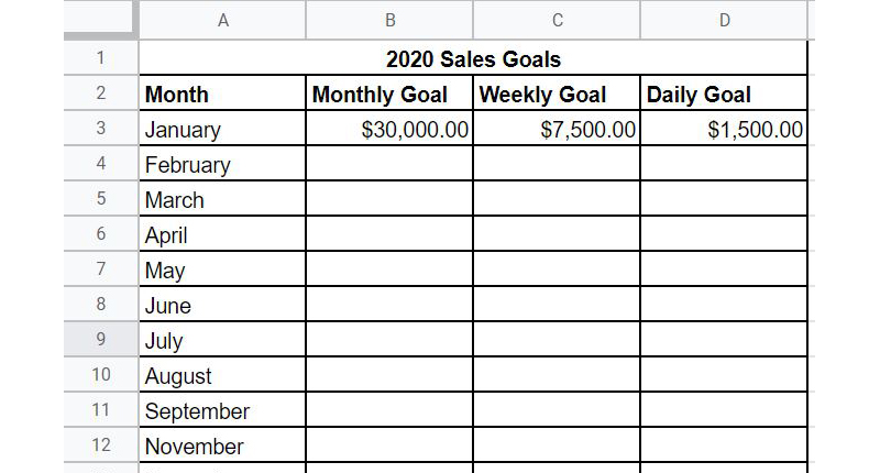 In Column A, list each month (January-December). In Column B, you are going to put down your sales goal for the month.