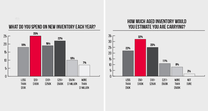 The greatest percentage of respondents (25 percent) reported spending $50,000 to $100,000 a year on inventory, and that same range also was the most-picked answer when survey-takers were asked how much aged inventory is in their store.