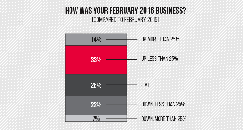 Nearly half (47 percent) of respondents said that sales were up as compared with February 2015, while 29 percent reported a year-over-year drop in sales.