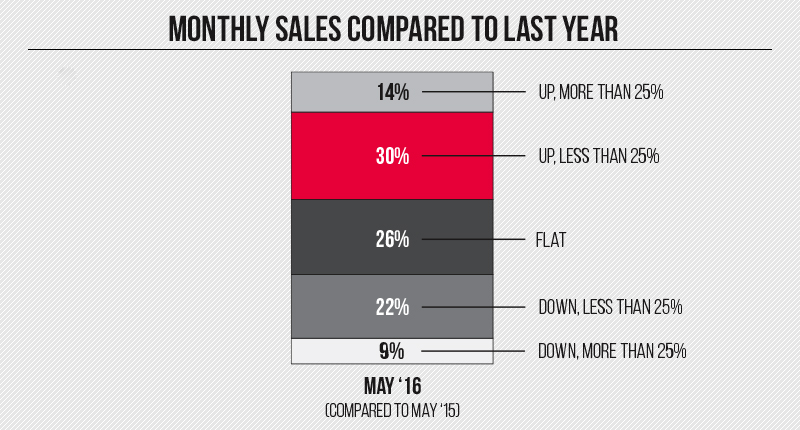 Seventy percent of respondents reported that business was the same in May 2016 as compared with May 2015, with the greatest percentage of those, 30 percent, reporting a 25 percent year-over-year increase in sales.