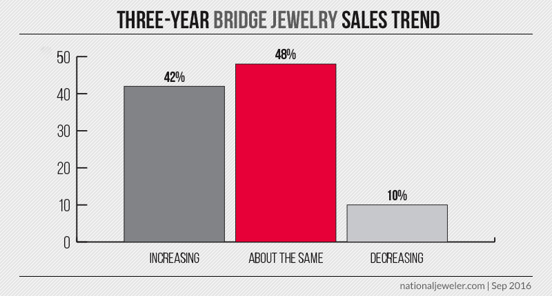 Nearly half (48 percent) of jewelers said that bridge jewelry sales have stayed about the same as a percentage of their overall sales in recent years, while another 43 percent said they have increased.