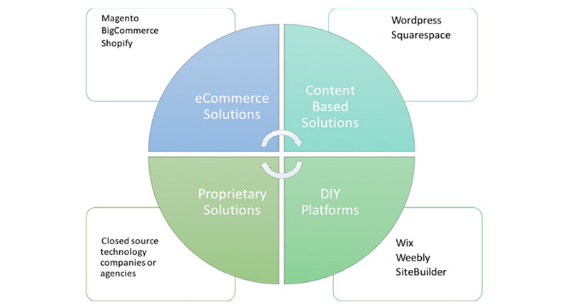The four types of web platforms on the market are: e-commerce, content-based, proprietary and DIY builders. Below, I explain each one while outlining their pros and cons.
