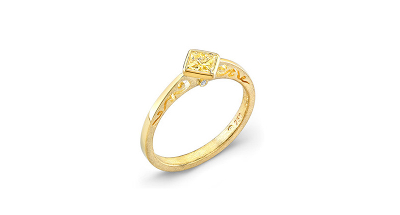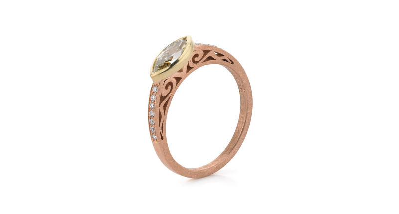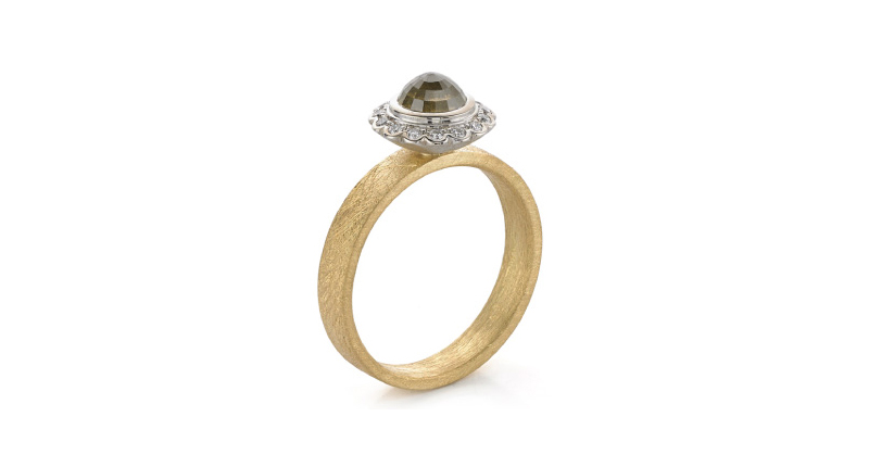 The brand also was showcasing a bridal collection that designer Alishan Halebian said is aimed at younger clients. The rings are toned-down versions of its classic bridal collection, featuring simple, sleek bands with smaller stones in cuts such as marquise, pear, and rose, and incorporating some mixed metals but with the same intricate details underneath and on the side.