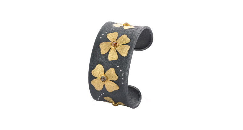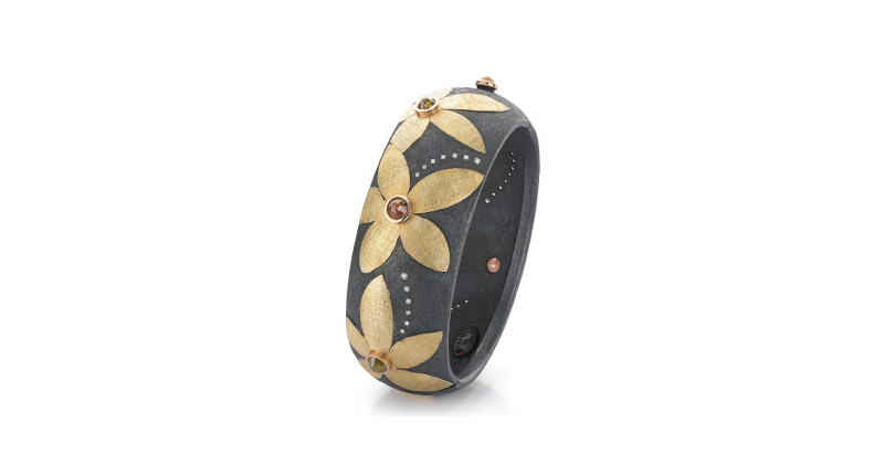 At JCK Tucson, which is taking place at the JW Marriott Tucson Starr Pass Resort through Sunday, Alishan was displaying new pieces of jewelry with floral motifs, at times mixing oxidized sterling silver and 18-karat yellow gold to give the organic look an edgier feel. The pieces were set with gems to add extra sparkle and color to the floral designs.