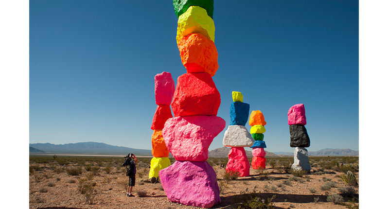 Seven Magic Mountains is an installation by Swiss artist Ugo Rondinone that is located in the desert just south of Las Vegas off I-15. The large-scale artwork consists of seven totems of brightly colored boulders stacked more than 30 feet high to “exhibit the presence of color and expression in the desert of the Ivanpah Valley.”