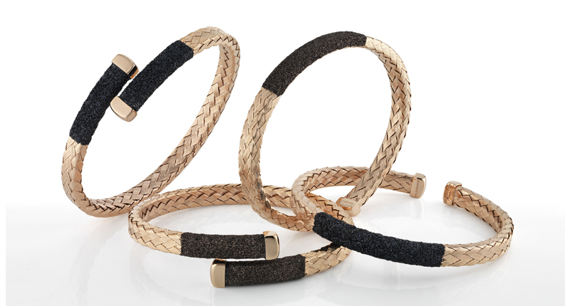 In English, “intreccio” translates to interweaving, and the new Intreccio collection from Pesavento appropriately featured woven strands of rose gold-plated sterling silver in malleable cuff styles, perfect for stacking up the arm.