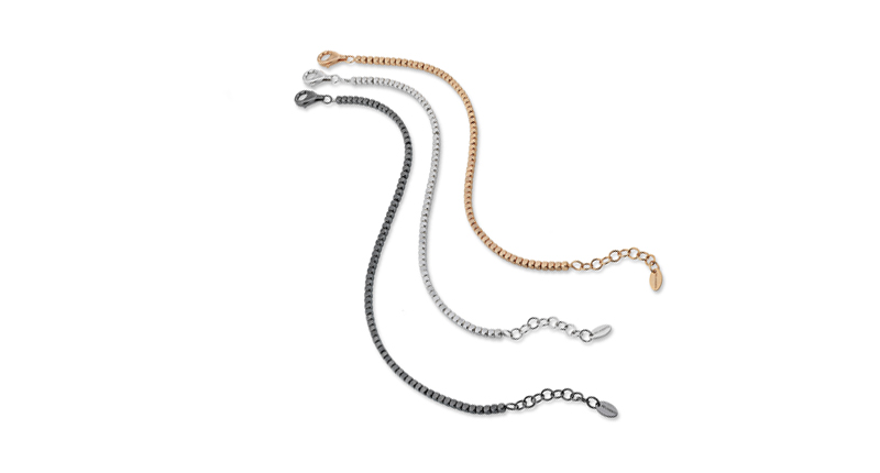 A perfect accompaniment to the look were the new cube bracelets, a simple and elegant everyday style of sterling silver cubes available in a rose gold, ruthenium or rhodium finish. The facets of each cube subtly catch the light, like an all-metal version of a diamond tennis bracelet.