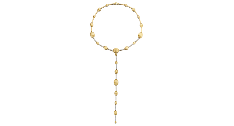 From its Dancing in the Rain collection, rendered in 18-karat yellow gold with signature hand-engraved gold beads, Nanis presented the new Aria necklace, in which each bead is connected to the next by a row of white diamonds. The necklace can be transformed into a long version, wrapped short version, a Y-necklace or deconstructed into a short necklace with bracelets.