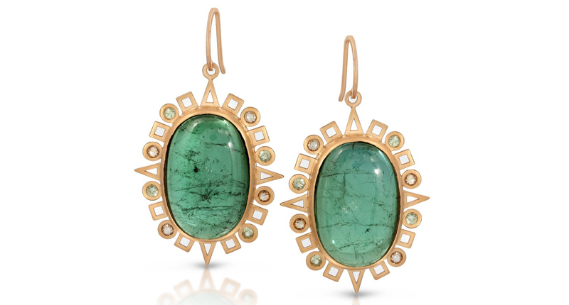 Debra Navarro (Booth 2500) is a gemstone lover, and for her, the rarer the better. The Kansas-located designer’s collection feels distinctly global, mixing stones from far-flung locations with materials like recycled gold in an effort toward producing responsibly-sourced jewels.